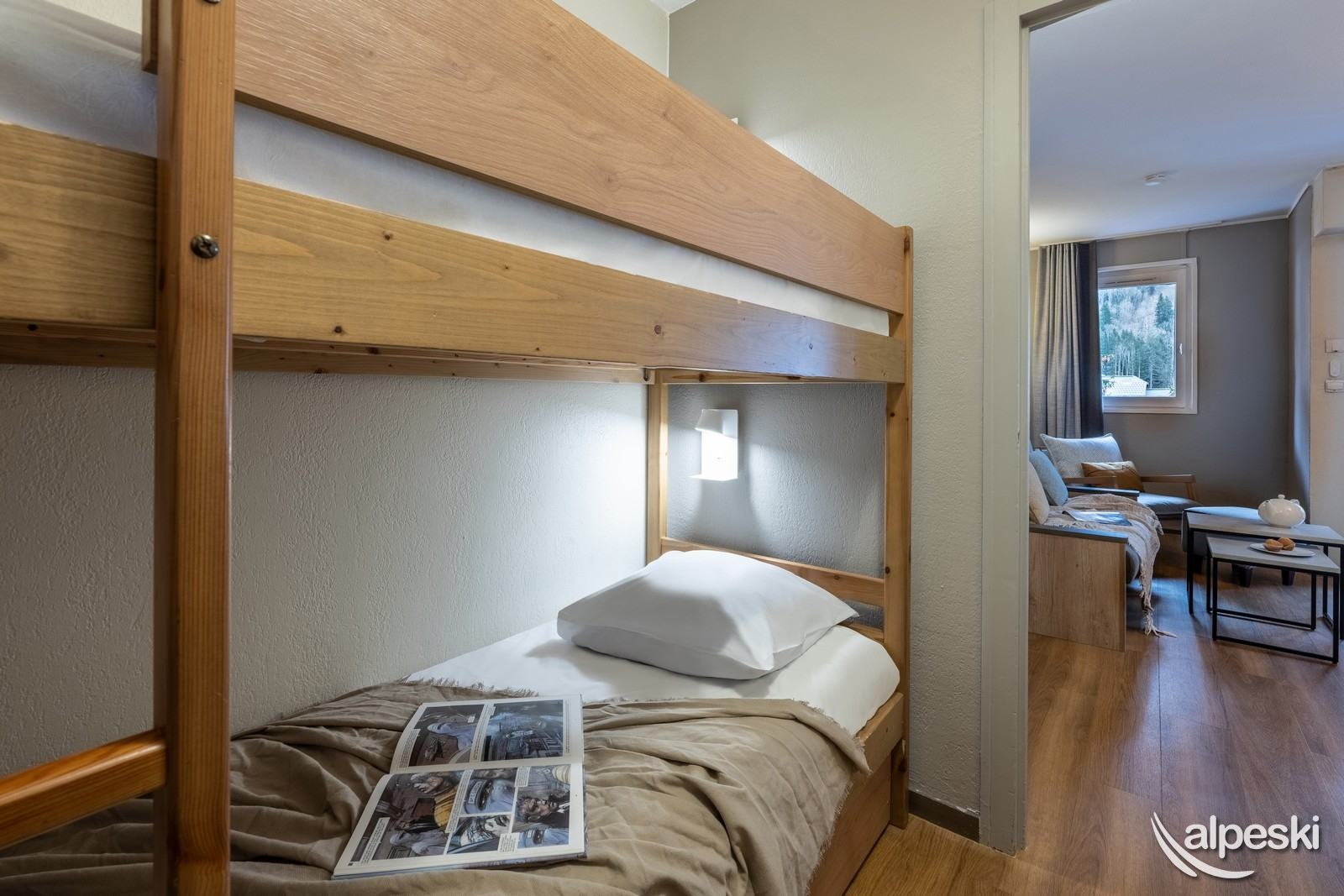 1 dormitorio con 1 cama doble y 1 zona litera con 2 camas en litera (recomendadas para niños) o individuales