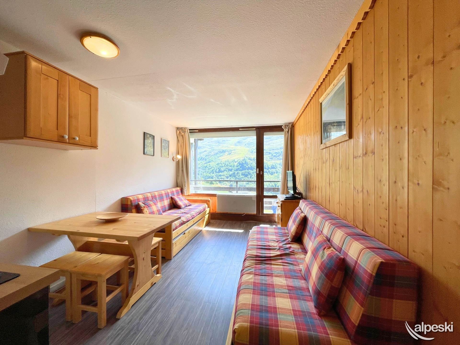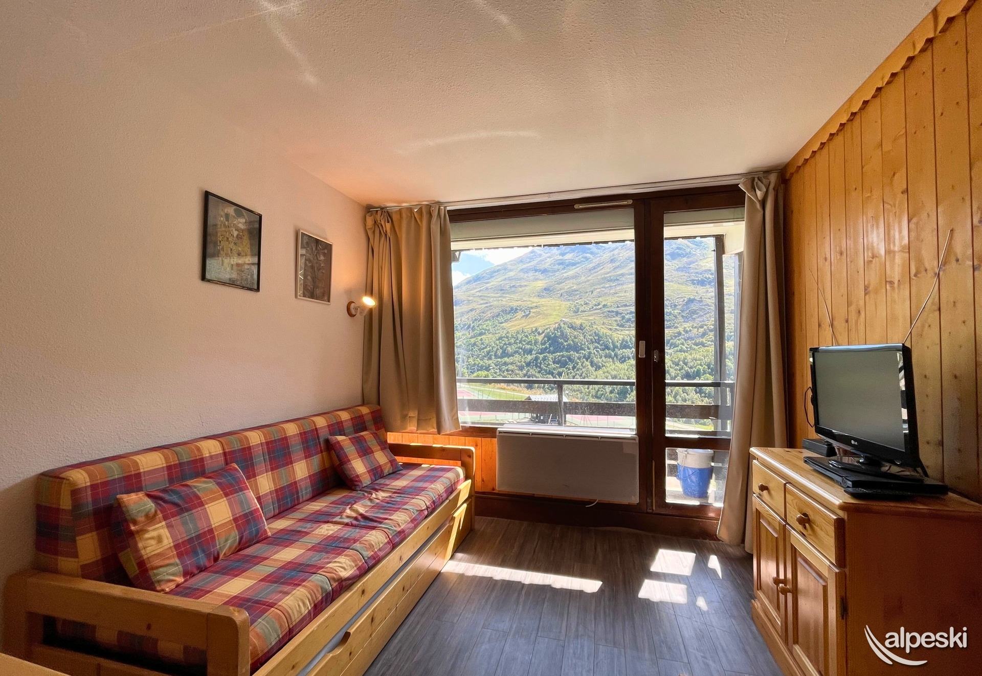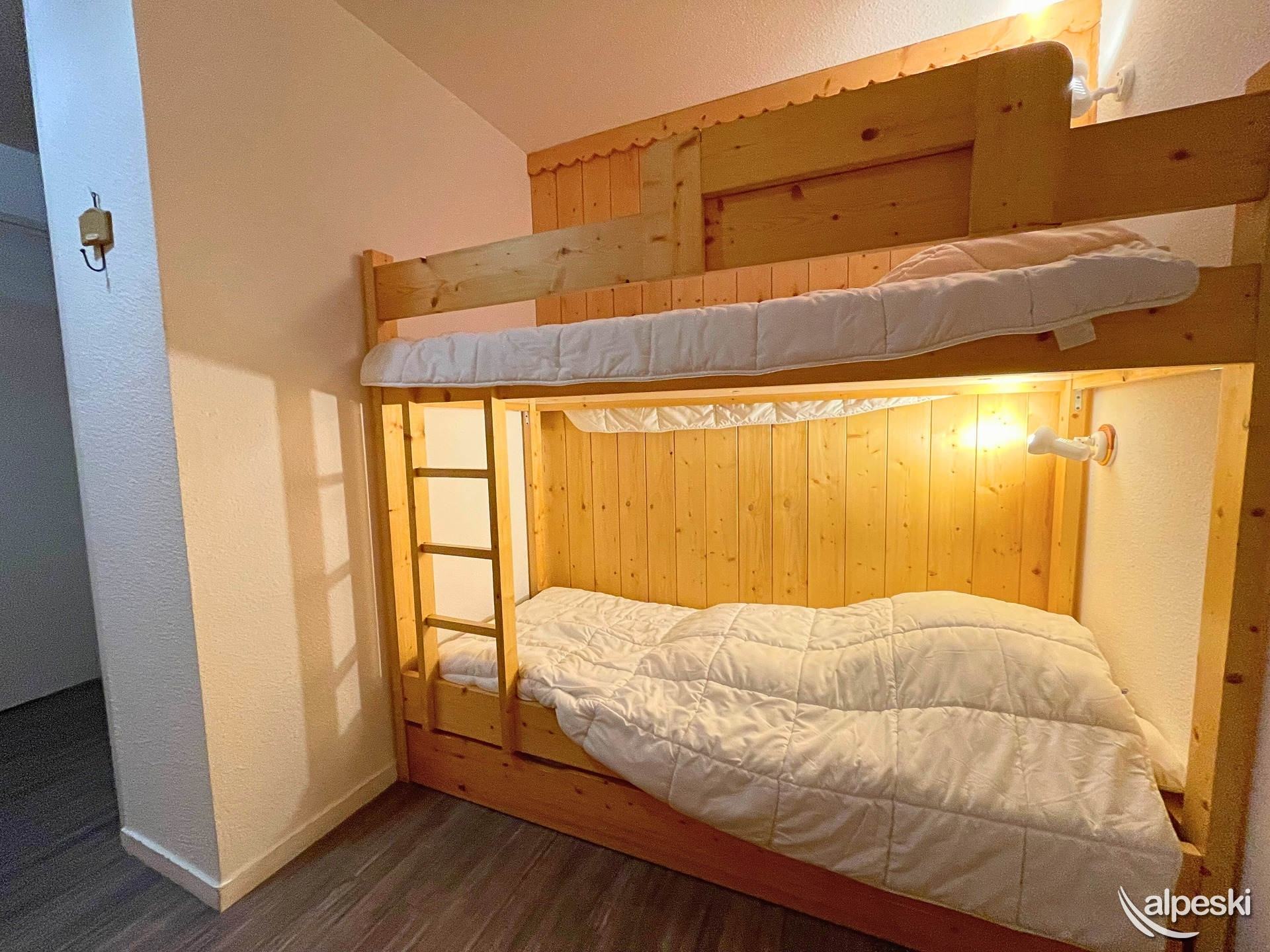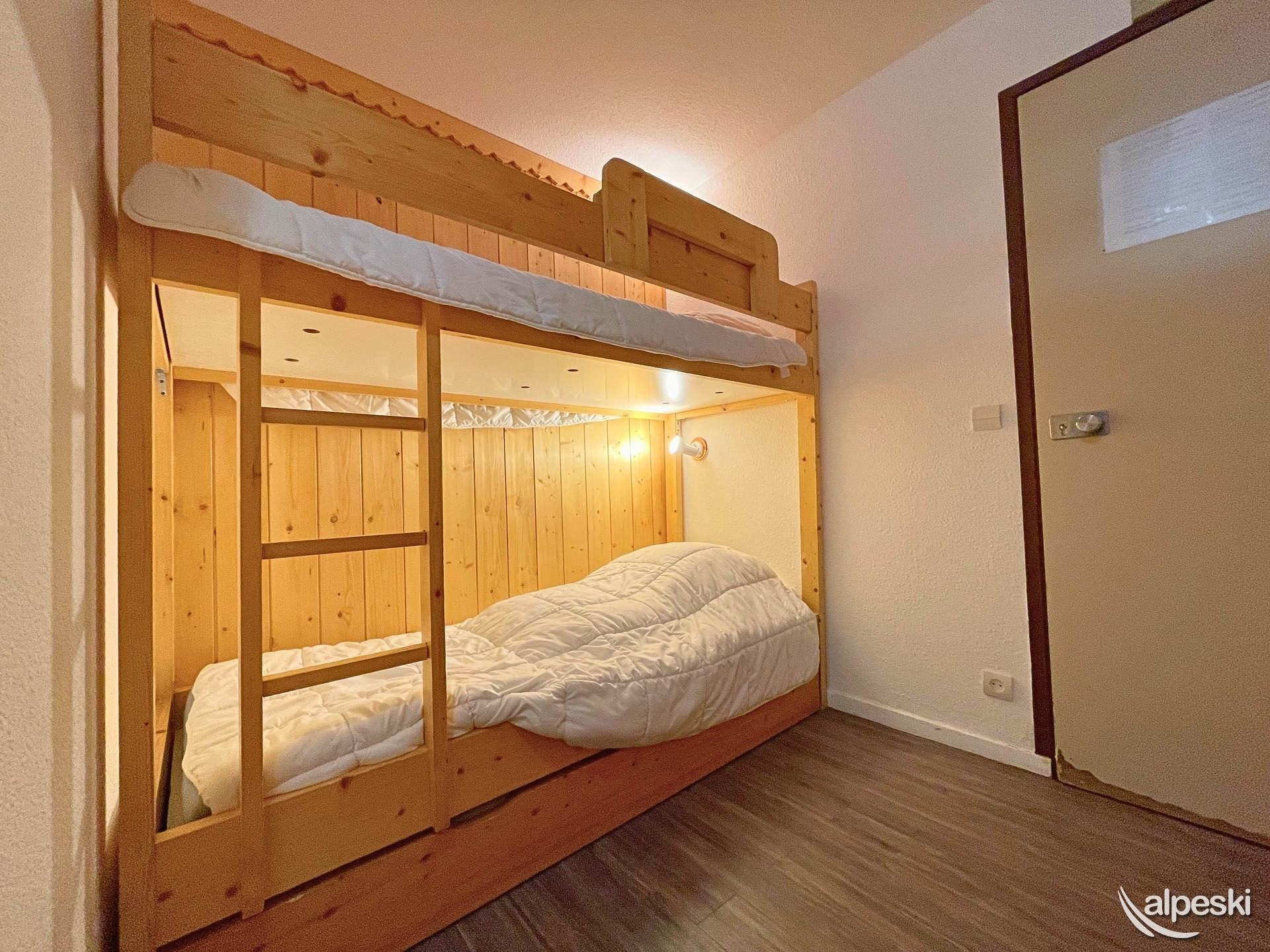 LES MENUIRES - Residencia Le Villaret (n.° 205), zona de Preyerand, apartamento de una habitación con camarote, para 4 personas, 25 m², en la 2.ª planta con ascensor, balcón orientado al oeste, vistas a la montaña. SERVICIOS DISPONIBLES CON RESERVA: ropa de cama (cama, aseo, cocina, etc.), servicios parahoteleros y otros servicios (sujeto a disponibilidad). Cocina: 4 placas eléctricas, minihorno, nevera con congelador, lavavajillas, cafetera, hervidor, tostadora. Salón-comedor: sofá, televisión, zona de dormir separada por una cortina con un sofá cama de 140 cm. Camarote: 1 litera (2 x 80 cm). Baño: lavabo, ducha. Aseo independiente. Información adicional: No se admiten animales. Apartamento para no fumadores. Equipado con edredones. Calefacción colectiva e individual. Apartamento con persianas enrollables. Guardaesquís en la 1.ª planta, cerrado. Se necesita una credencial para acceder. Categoría: CONFORT. Sello de calidad del complejo: 2 copos de nieve "Plata".