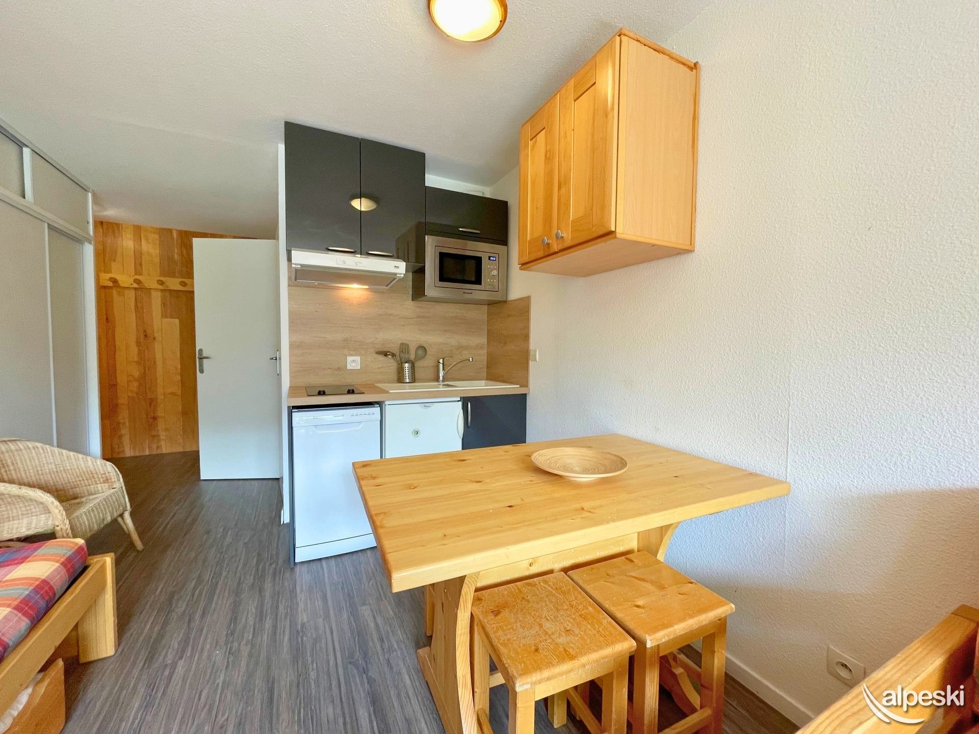 LES MENUIRES - Preyerand Area Residence Le Villaret (N°106), estudio con una habitación cabina para 4 personas 26m², en el 1er piso con ascensor, balcón orientado al oeste, vista a las montañas SERVICIOS DISPONIBLES CON RESERVA: ropa de cama (cama, inodoro, cocina, etc.), servicios parahoteleros y otros servicios (sujeto a disponibilidad). Cocina: placa eléctrica (x2), horno, microondas, nevera, lavavajillas, cafetera y Philips Senseo Dosette, tostadora, set de fondue y raclette Salón/comedor: zona de dormir separada por una cortina con 1 cama doble (140 cm), televisión, persianas eléctricas Habitación cabina: 1 litera (2x80cm) Baño: lavabo, ducha WC independiente Información adicional: No se admiten animales Apartamento para no fumadores Equipado con edredones individuales (x2) y edredones dobles (x2) Calefacción colectiva e individual Mesa de metal y 2 sillas en el balcón Guardaesquís en el 1er piso cerrado. Necesitas una credencial para participar Categoría: CLASSIQUE Etiqueta de calidad del resort: 2 copos de nieve "Plata"