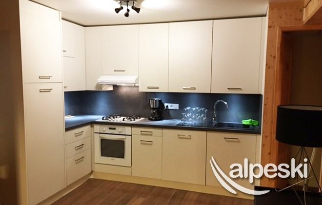 Cocina totalmente equipada con horno, microondas, lavavajillas, nevera, congelador, cafetera, juego de raclette.