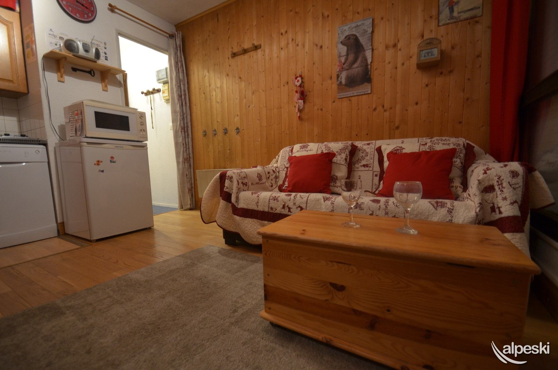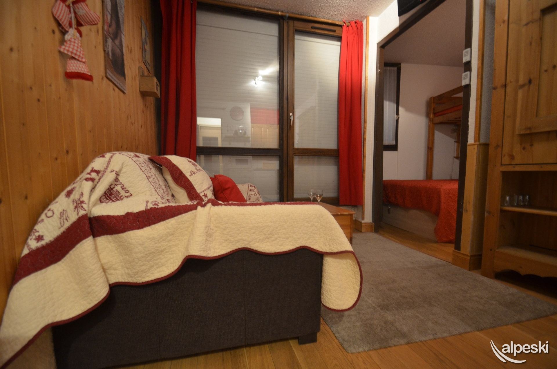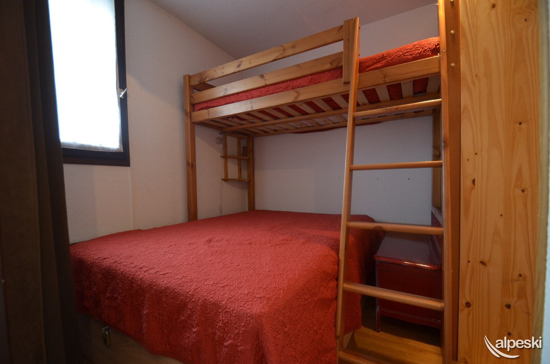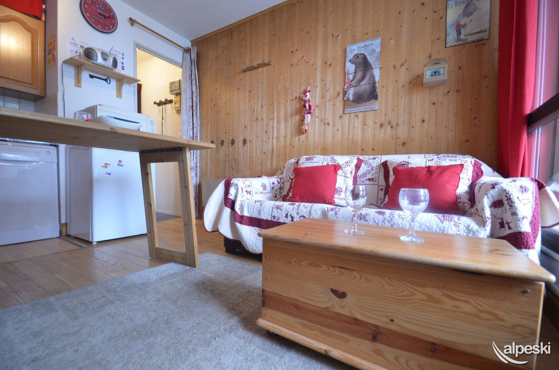 LES MENUIRES - Reberty 1850. Residencia Le Mélèze (n.° 68), estudio para 2 personas de 28 m², en la planta 0, con balcón orientado al suroeste y vistas a la montaña. SERVICIOS DISPONIBLES CON RESERVA: ropa de cama, aseo, cocina, etc., servicios de parahotel y otros servicios (sujeto a disponibilidad). Cocina: 2 placas eléctricas, microondas con grill, frigorífico con congelador de 5 l, lavavajillas, cafetera, tostadora, hervidor de agua, set de raclette y fondue. Salón: 1 sofá, televisor de pantalla plana. Zona de dormir separable con cortinas: 1 cama doble (140 x 190 cm), 1 litera (1 x 80 cm). Baño: lavabo, bañera, secador de toallas. Aseo independiente. Información adicional: No se admiten animales. Apartamento para no fumadores. Equipado con mantas y edredones. Guardaesquís. Categoría: CLÁSICA. Sello de calidad del complejo: 2 copos de nieve "Bronzer".