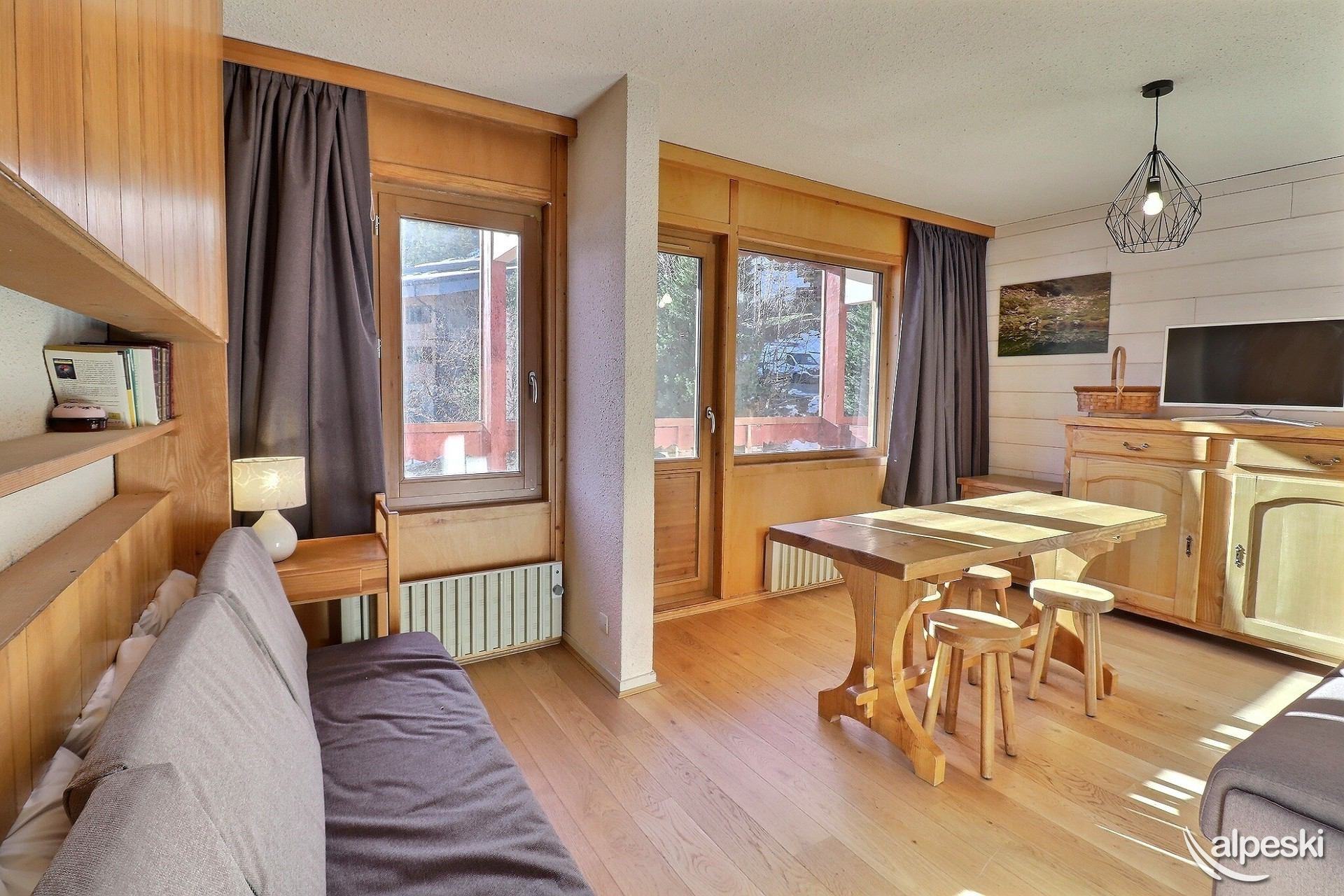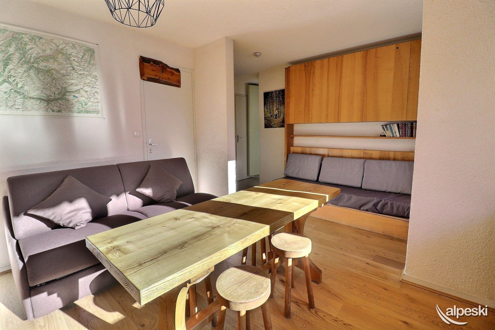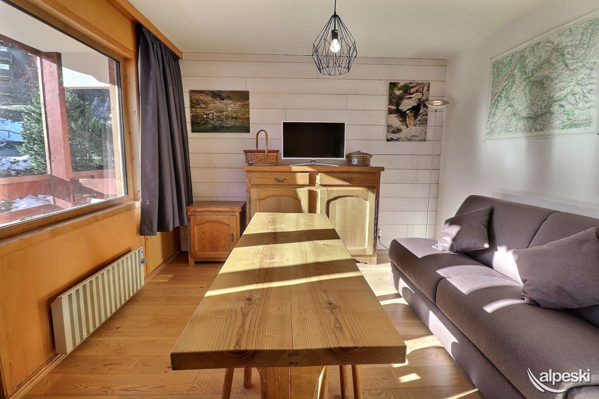 RESIDENCIA LE MONT VALLON N° 15 - Tipo C1 Clasificación 1* para 4 personas Estudio con cabina, 4 Personas, 32m², Balcón Sur, 1er Piso (lado pistas) 2do piso sin ascensor (lado entrada) Sala de estar: 1 sofá cama para 2 personas (140x190) y banco (sin ropa de cama) Cabina: 1 juego de literas (90x190) Cocina abierta: microondas, horno, refrigerador, lavavajillas, 2 placas de inducción, 1 cafetera de filtro, 1 tostadora, 1 hervidor eléctrico Baño - WC separado TV de pantalla plana incluida MASCOTAS ADMITIDAS - NO FUMADORES Excelente vista, acceso a un balcón amueblado con mesa y sillas
