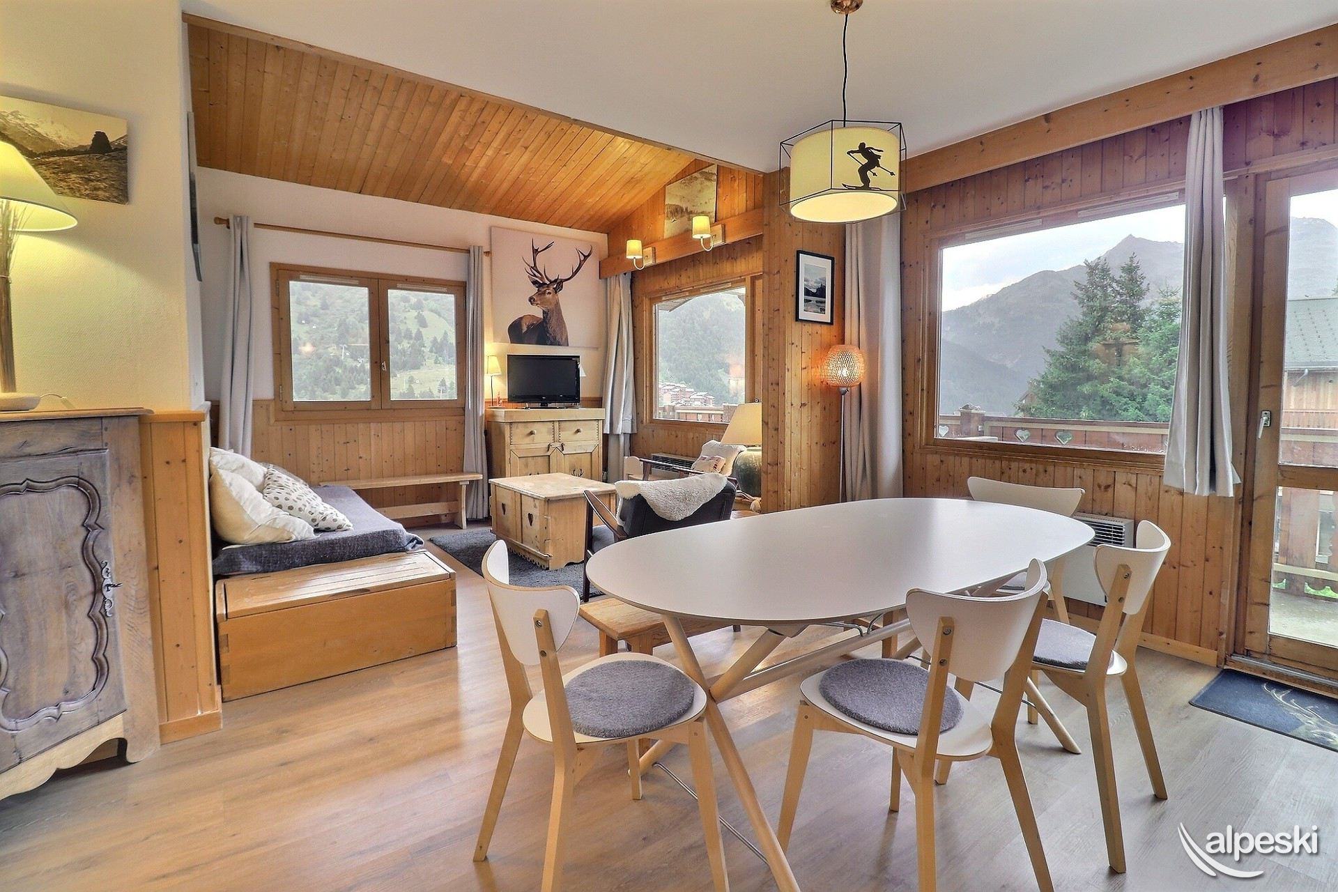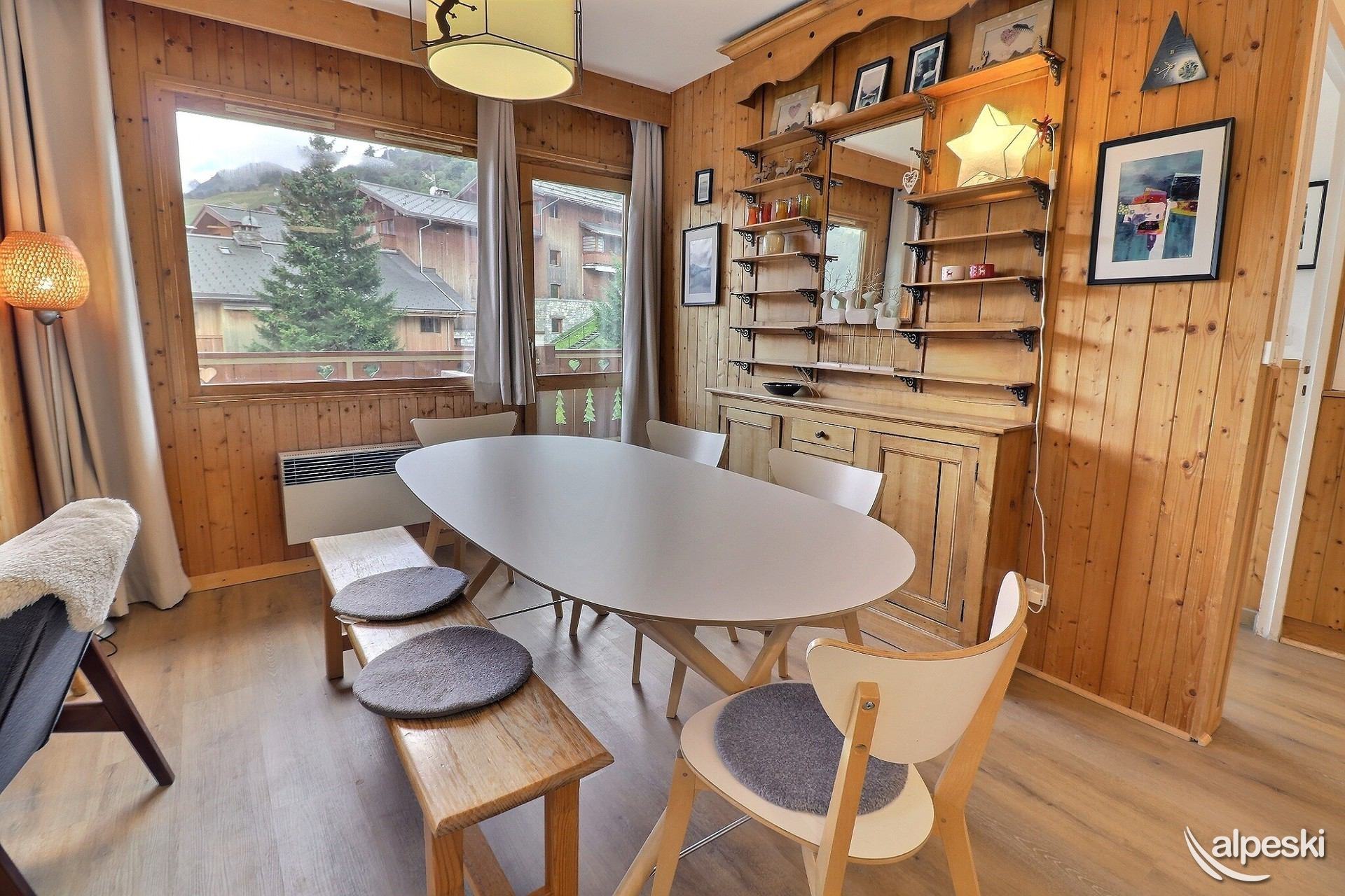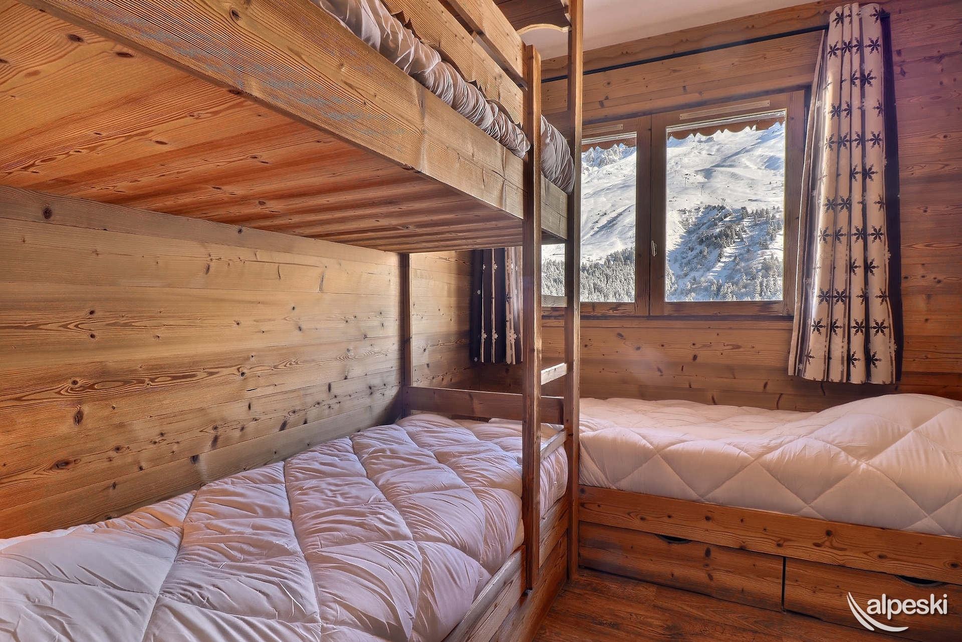 RESIDENCIA LA VANOISE N° 23 - TIPO G2 Clasificación 3* para 6 personas Etiqueta Méribel - Apartamento con encanto 3 habitaciones, 5/6 personas, 57m², Amplio balcón en ángulo sur y este, 4º piso Salón: 3 sillones y 1 sofá Cocina abierta: horno, microondas, frigorífico americano, lavavajillas, 3 placas de inducción, campana extractora Habitación sur y este: 1 cama doble (140x190cm) Habitación este: 1 cama doble (140x190cm) y 1 juego de literas (80x190cm) Cuarto de ducha con lavadora-secadora - WC separado Televisión de pantalla plana incluida ACCESO GRATUITO A INTERNET (la conexión depende del servicio del proveedor y no puede ser garantizada por la agencia) NO SE ADMITEN MASCOTAS - NO FUMAR