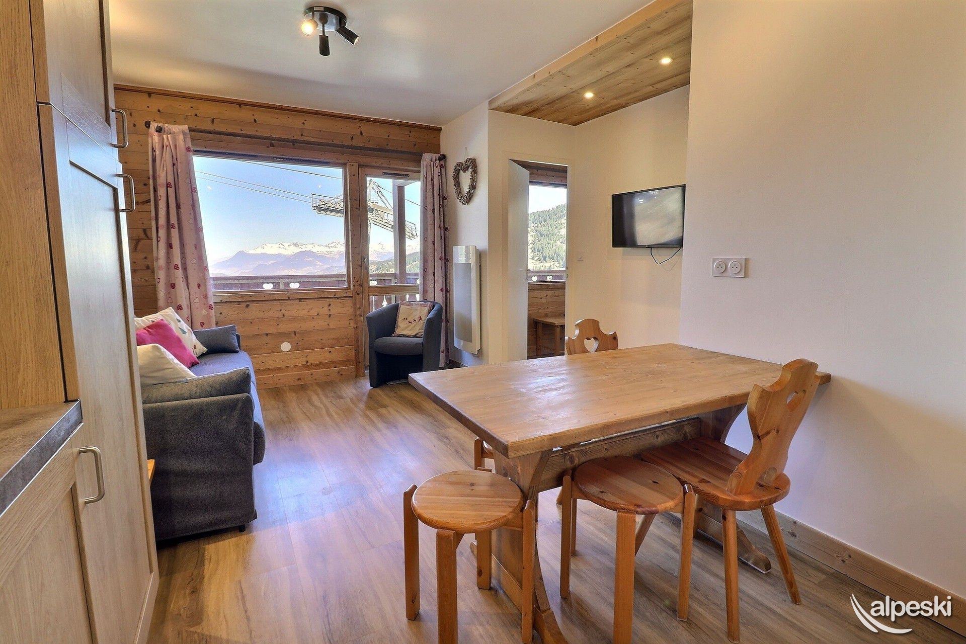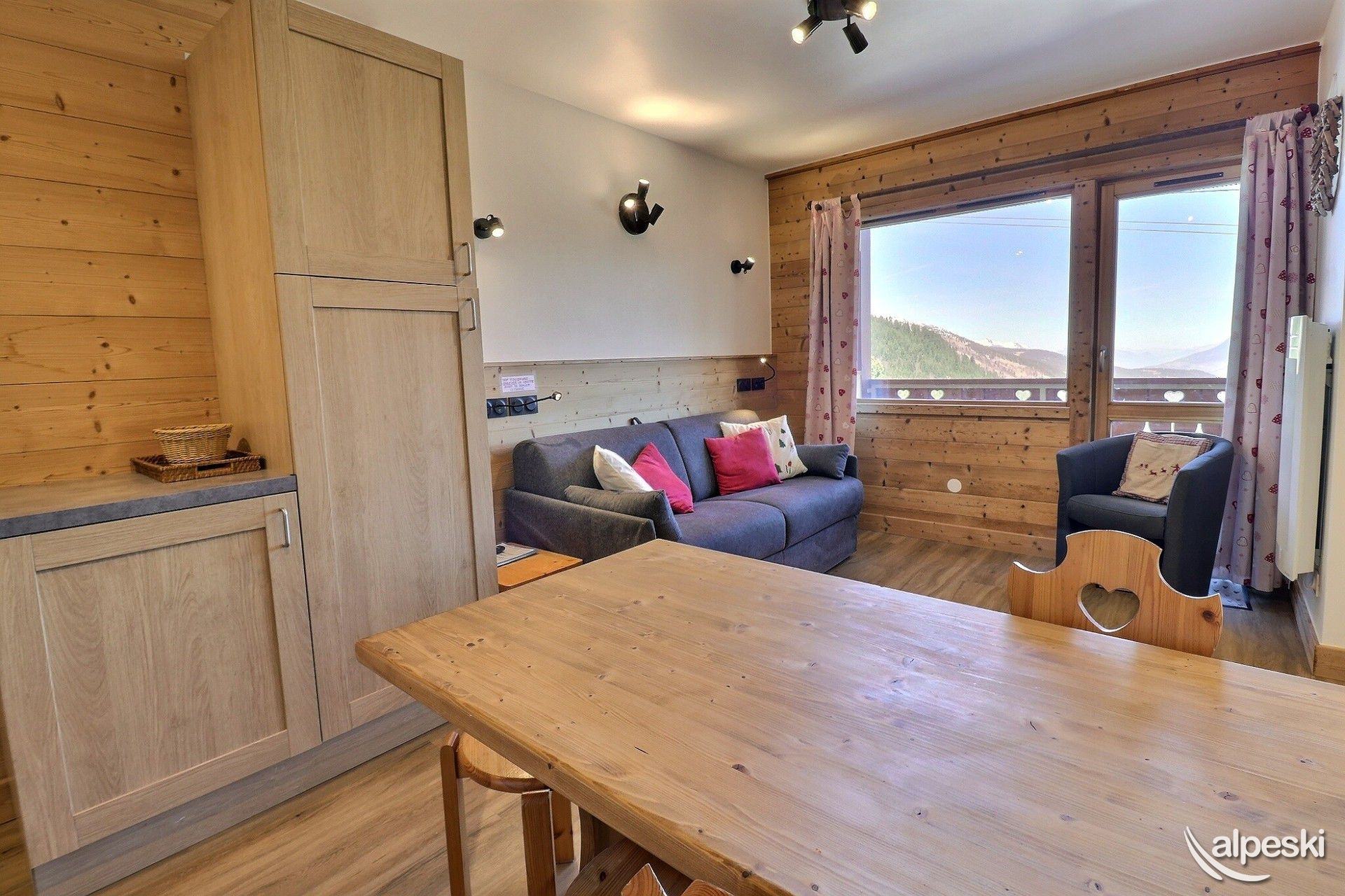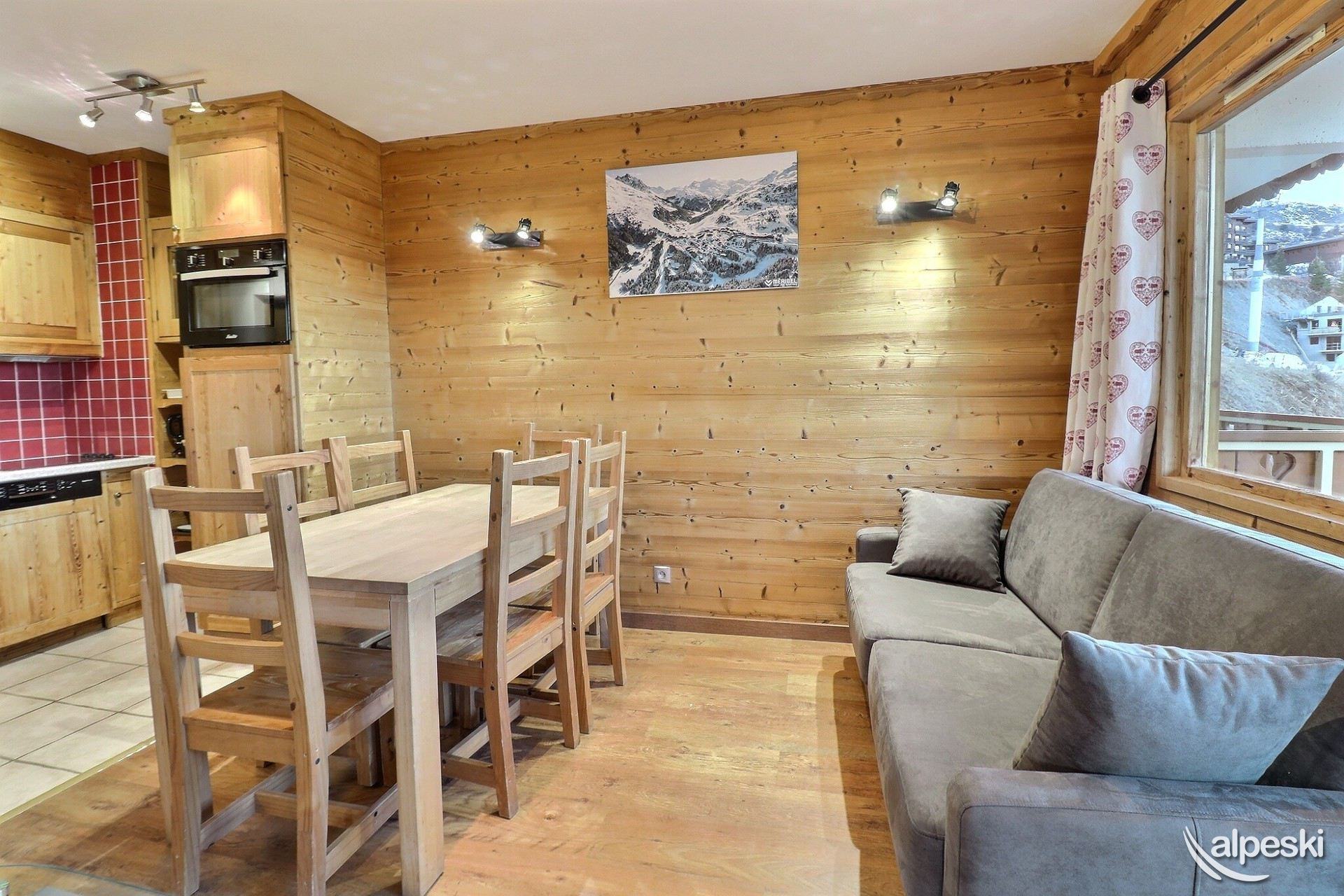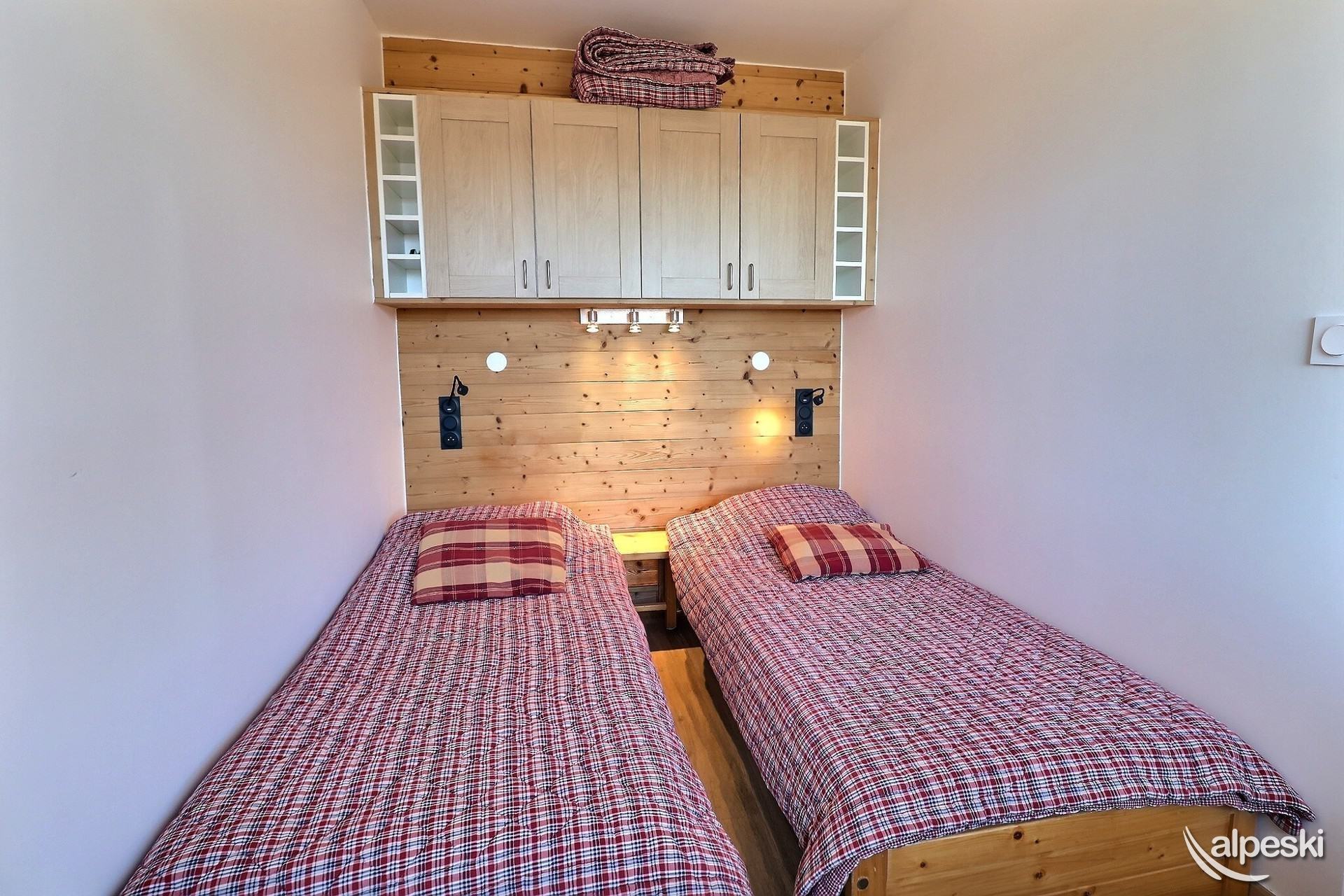 RESIDENCIA LA VANOISE N° 11 - Tipo C1 - Ascensor 1 - Clasificación 2* para 4 personas - 2 habitaciones, 4 personas, 29 m², balcón norte, 3.ª planta. Salón: 1 sofá cama para 2 personas (160x190). Dormitorio: 2 camas individuales (80x190). Luces de lectura con tomas USB. Cocina americana: horno, nevera, 2 placas eléctricas, lavavajillas, campana extractora, cafetera de filtro, cafetera Nespresso, tostadora, hervidor eléctrico. Baño con ducha. TV de pantalla plana incluida. NO SE ADMITEN MASCOTAS. NO FUMAR.