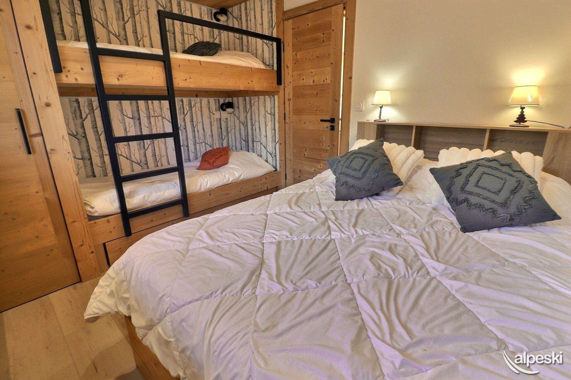 RESIDENCIA LA VANOISE N° 19 TIPO D2 Clasificación 1* para 5 personas 2 habitaciones, 5/6 personas, 38m², Balcón Sur, 1er piso Salón: 1 sofá cama para 2 personas (140x190), 1 banco cama (90x190) Rincón de dormir: 2 literas (80x190) Dormitorio: 1 cama doble (140x190) Rincón de cocina: horno, refrigerador, lavavajillas, 2 placas eléctricas, microondas, cafetera de filtro, tostadora, hervidor eléctrico, campana extractora Baño - WC separado TV de pantalla plana incluida NO FUMAR - SE ADMITEN MASCOTAS