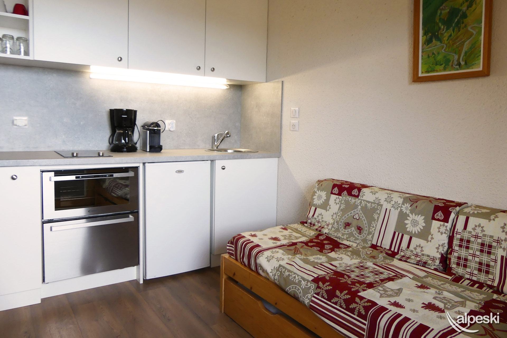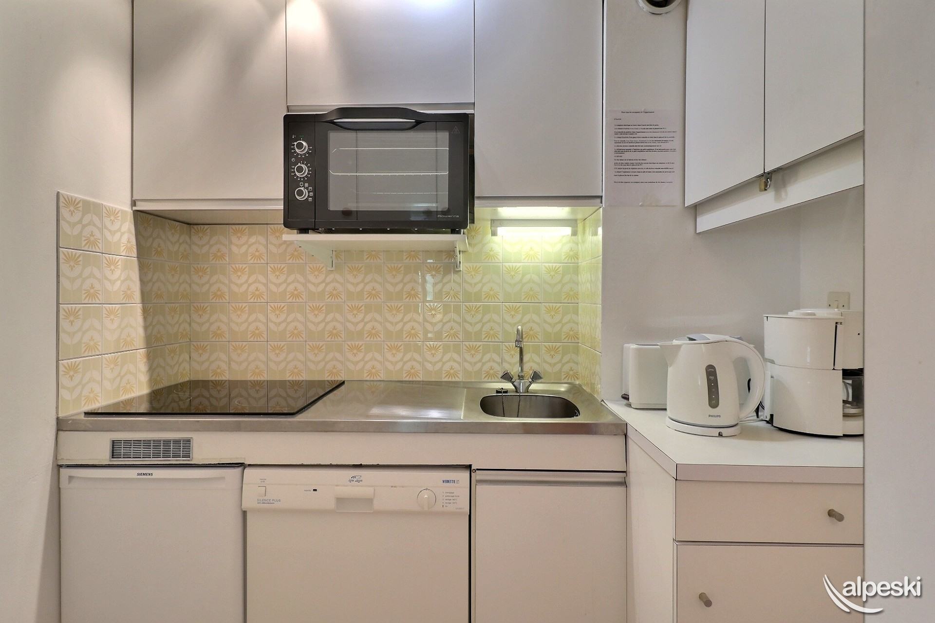 RESIDENCIA LA VANOISE N° 16 - Tipo B1 1* clasificación para 3 personas Pequeño 2 habitaciones, 3/4 personas, 23m², Balcón Norte, 1er piso Salón: 1 cama (80x190) y 1 cama plegable (80x190) Dormitorio: 1 cama doble (140x190) Rincón cocina: 2 placas vitrocerámicas, frigorífico, horno, lavavajillas pequeño, 1 cafetera Magimix Nespresso, cafetera de filtro, tostadora, hervidor eléctrico Baño con WC TV de pantalla plana incluida NO FUMAR - ANIMALES PROHIBIDOS