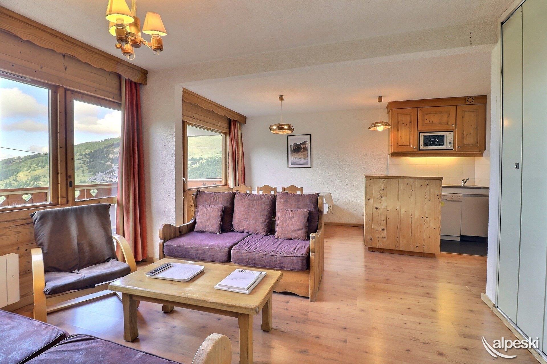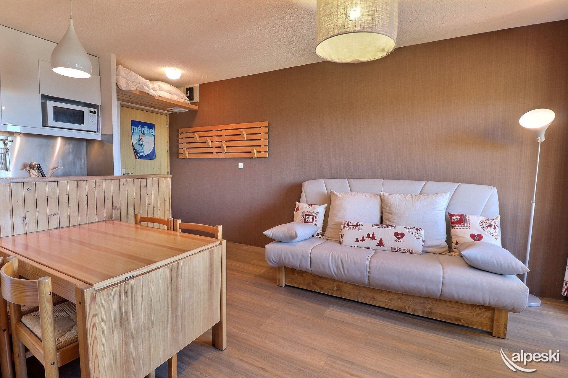 RESIDENCIA LA VANOISE N°22 - TIPO E1 Clasificación 2* para 6 personas Etiqueta Méribel - Apartamento con encanto 3 habitaciones, 6 personas, 39m², Balcón Norte/Este, 4ª planta Salón: 1 sofá cama para 2 personas (140x190) Habitación Norte: 1 cama doble (140x190) Habitación Este: 1 cama individual y literas (80x190) Cocina: horno con microondas, frigorífico, lavavajillas, 4 placas eléctricas, cafetera de filtro, tostadora, hervidor eléctrico, campana extractora Cuarto de ducha - WC separado SE ADMITEN MASCOTAS - NO FUMADORES