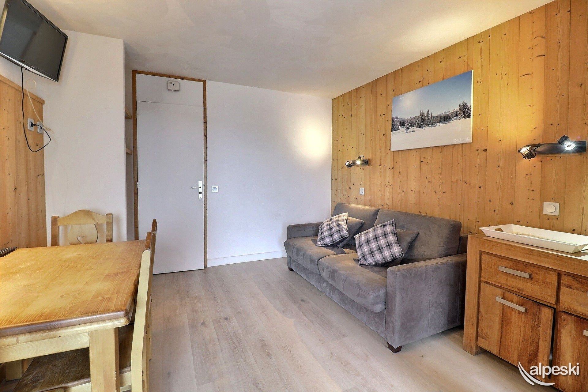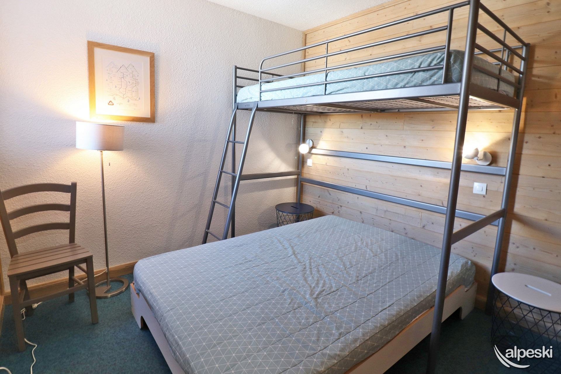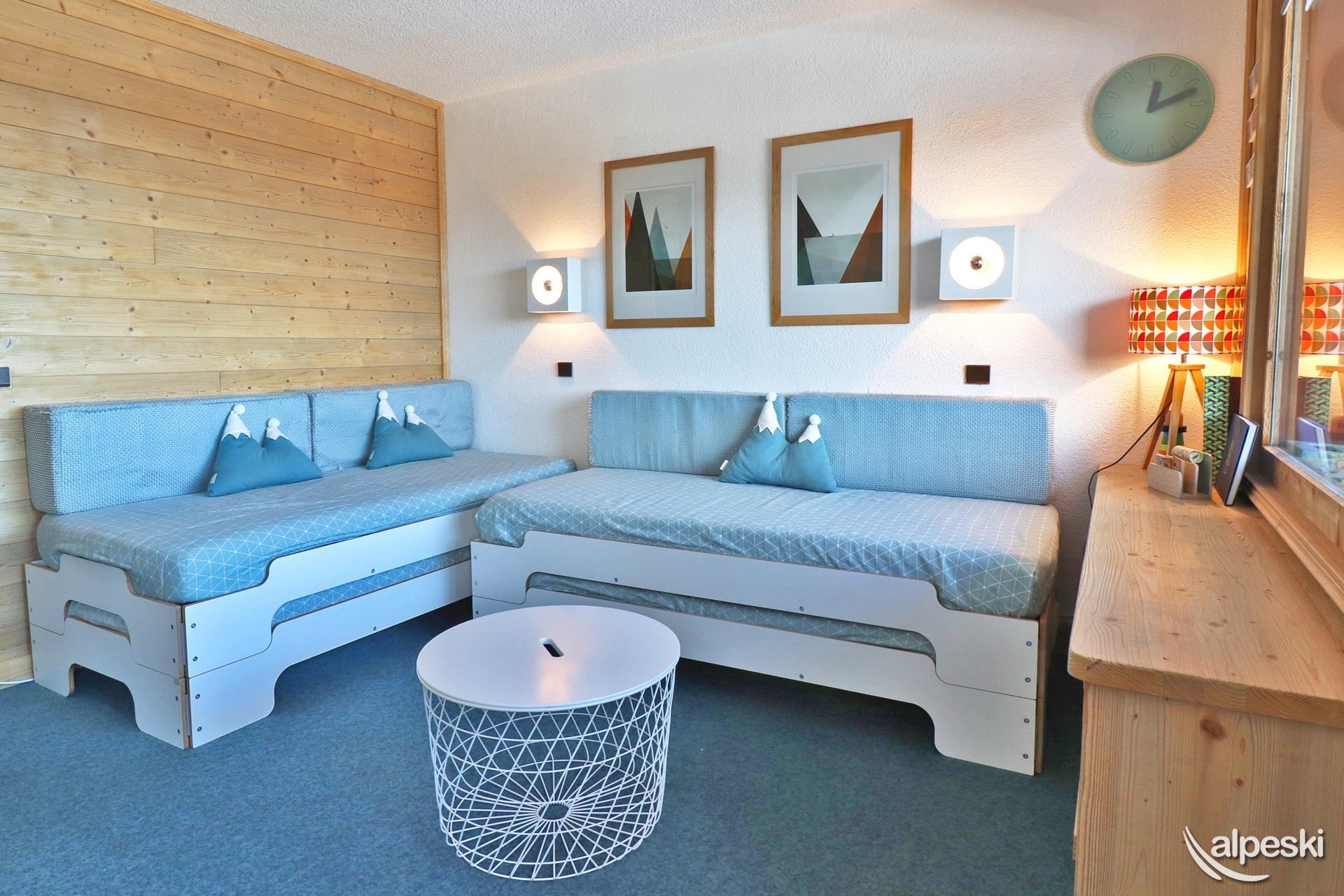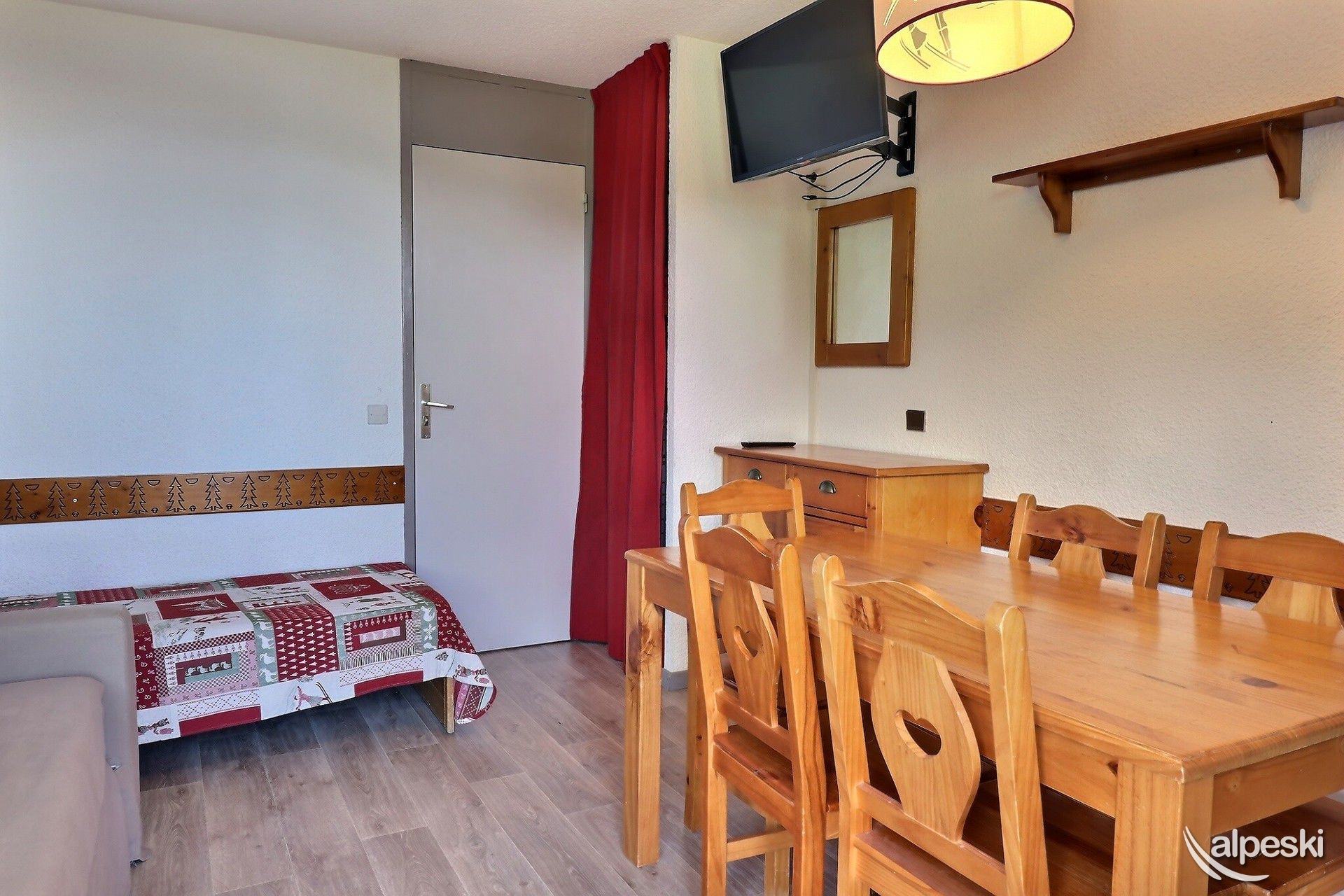 RESIDENCE CREUX DE L'OURS A30- TIPO D1 Clasificación 2* para 5 personas 2 habitaciones, 5 personas, 38m², Norte, Primer piso Útil: pasillo privado en la entrada del apartamento donde puede guardar sus esquís y zapatos Dormitorio: 1 cama individual en el entrepiso (90x190) y 1 cama doble (140x190) Sala de estar: 2 camas individuales (90x190) Cocina abierta: horno pequeño, microondas, refrigerador, lavavajillas, 2 placas de vitrocerámica, 1 cafetera Nespresso, cafetera de filtro, tostadora Moulinex, hervidor eléctrico Moulinex Baño - WC separado TV de pantalla plana incluida 1 silla de bebé y 1 cuna - juegos para niños Conexión Wi-Fi gratuita según la empresa administradora del edificio - conexión no garantizada NO FUMAR - MASCOTAS PROHIBIDAS