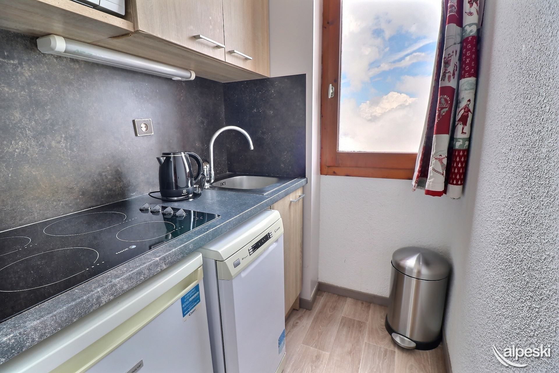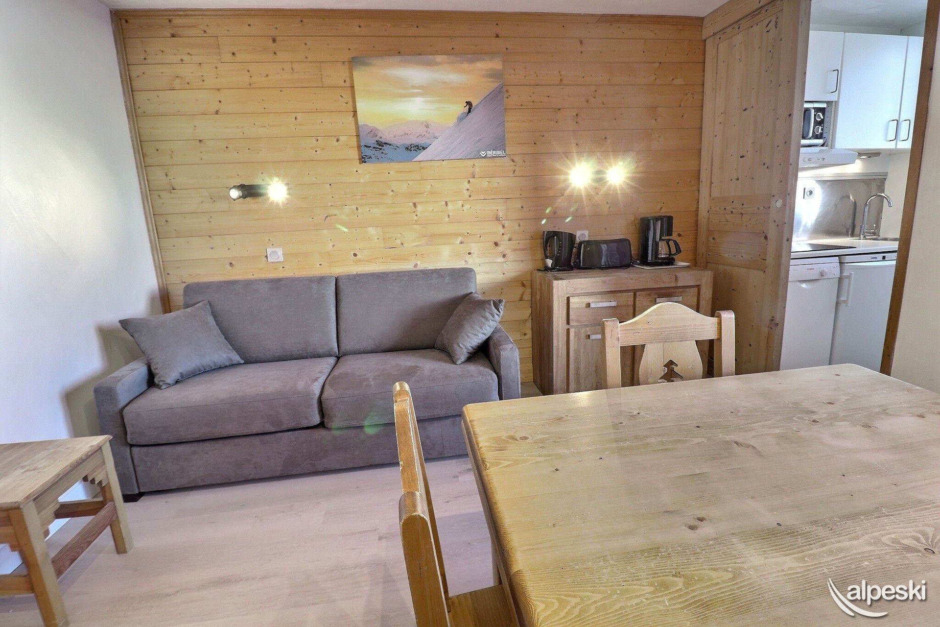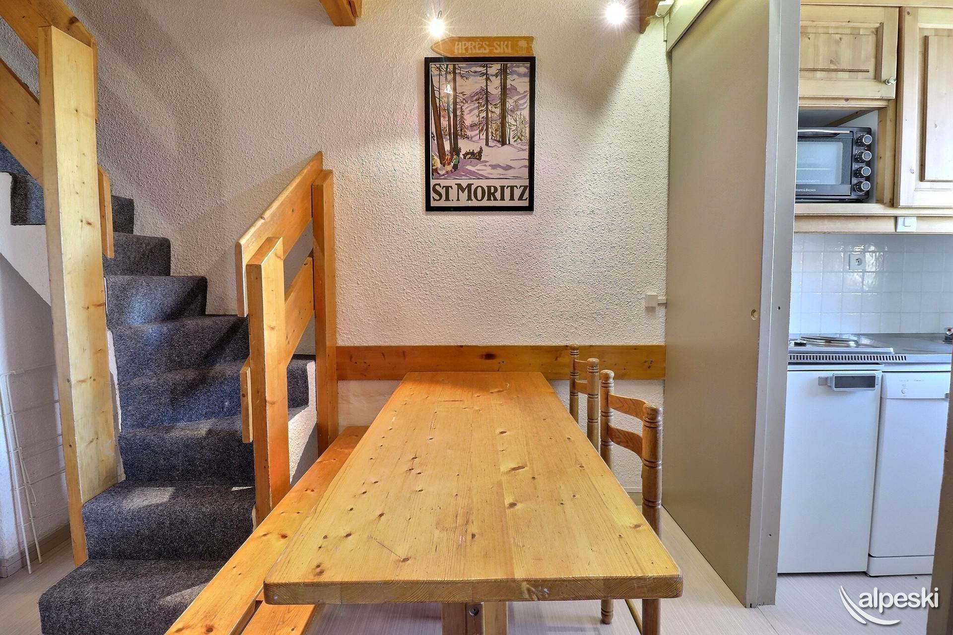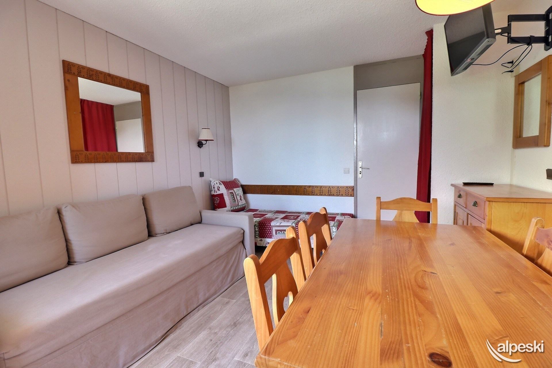 RESIDENCE CREUX DE L'OURS A30- TIPO D1 Clasificación 2* para 5 personas 2 habitaciones, 5 personas, 38m², Norte, Primer piso Útil: pasillo privado en la entrada del apartamento donde puede guardar sus esquís y zapatos Dormitorio: 1 cama individual en el entrepiso (90x190) y 1 cama doble (140x190) Sala de estar: 2 camas individuales (90x190) Cocina abierta: horno pequeño, microondas, refrigerador, lavavajillas, 2 placas de vitrocerámica, 1 cafetera Nespresso, cafetera de filtro, tostadora Moulinex, hervidor eléctrico Moulinex Baño - WC separado TV de pantalla plana incluida 1 silla de bebé y 1 cuna - juegos para niños Conexión Wi-Fi gratuita según la empresa administradora del edificio - conexión no garantizada NO FUMAR - MASCOTAS PROHIBIDAS