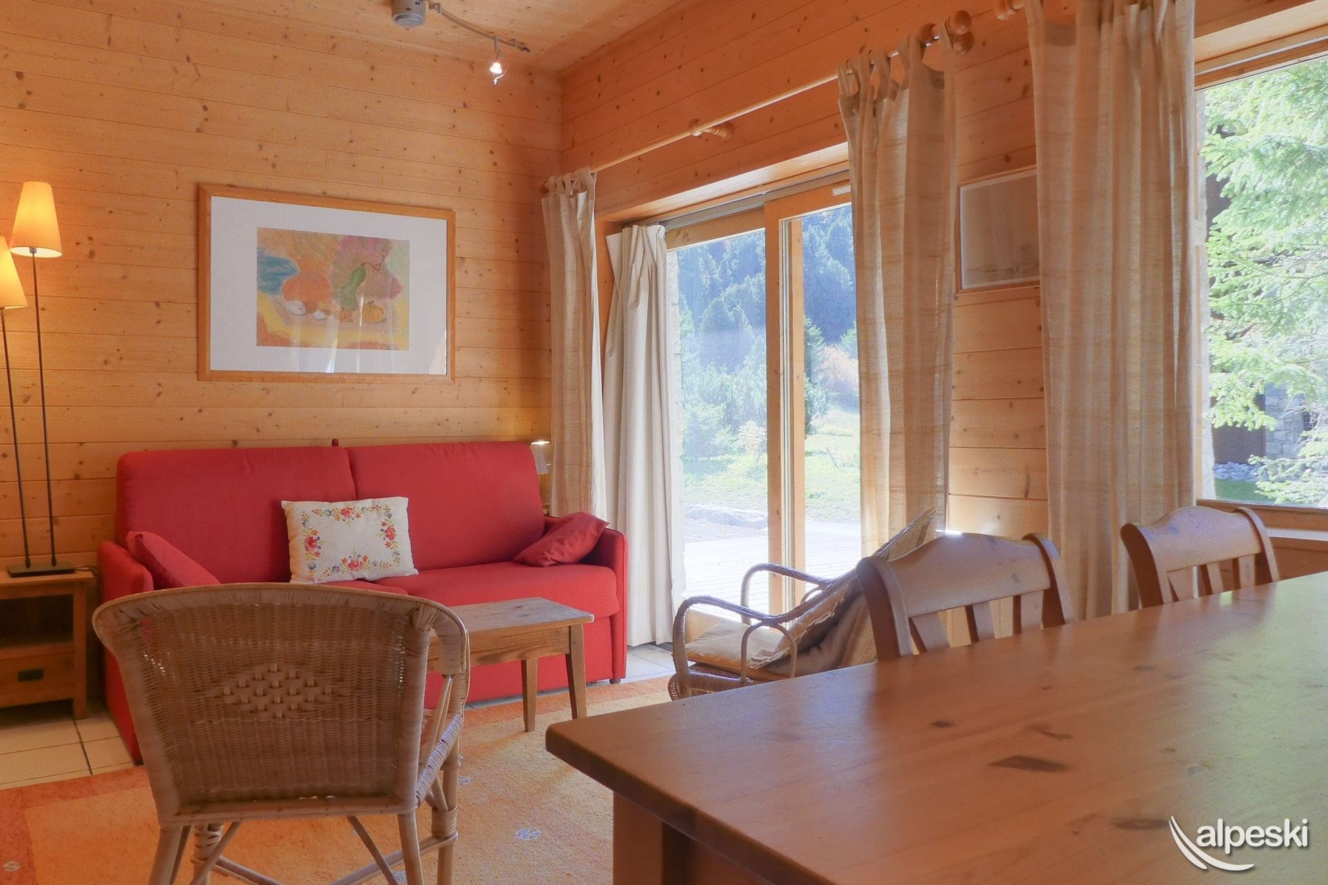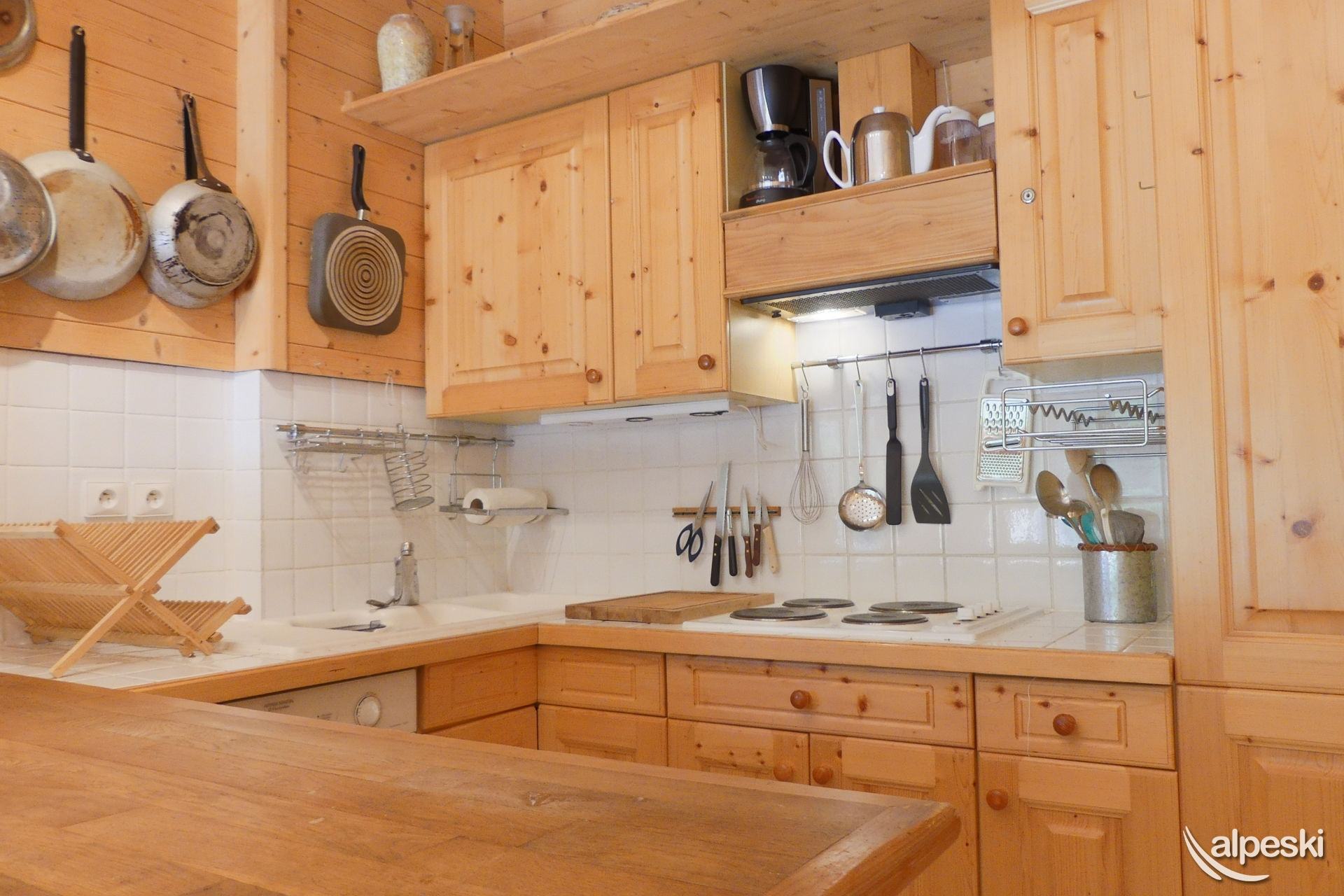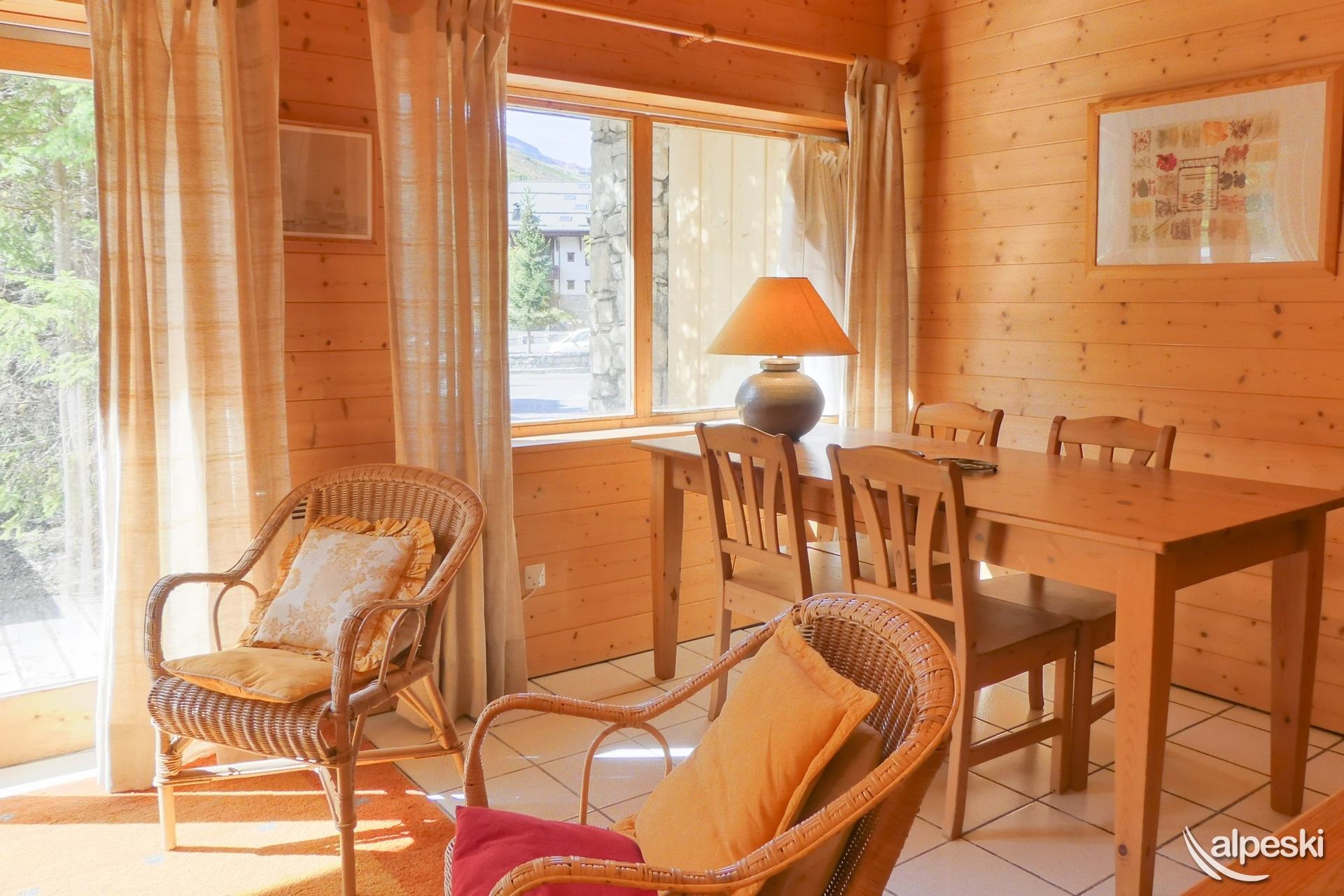 CAIRN DE TUEDA 5 - Tipo C 3* clasificación para 4 personas Etiqueta Meribel - Apartamento con encanto 2 habitaciones con rincón de montaña, 4/5 personas, 37m², terraza oeste Planta baja Salón: 1 sofá cama "rapido" para 2 personas (140x180) Dormitorio: 2 camas individuales (convertidas en cama doble 80x190) Rincón de montaña: 1 cama individual plegable (70x190) Rincón de cocina: horno con microondas, frigorífico, lavavajillas, 4 placas eléctricas, 1 cafetera de filtro MOULINEX, tostadora SEB, hervidor eléctrico TEFAL Baño - Aseos separados Guardaesquís con secador de botas Terraza con un pequeño jardín TV de pantalla plana incluida - Reproductor de DVD ACCESO GRATUITO A INTERNET, la conexión a Internet no se puede garantizar, depende del proveedor NO FUMAR - MASCOTAS PROHIBIDAS