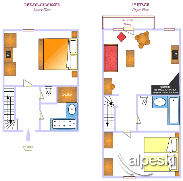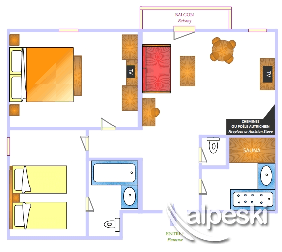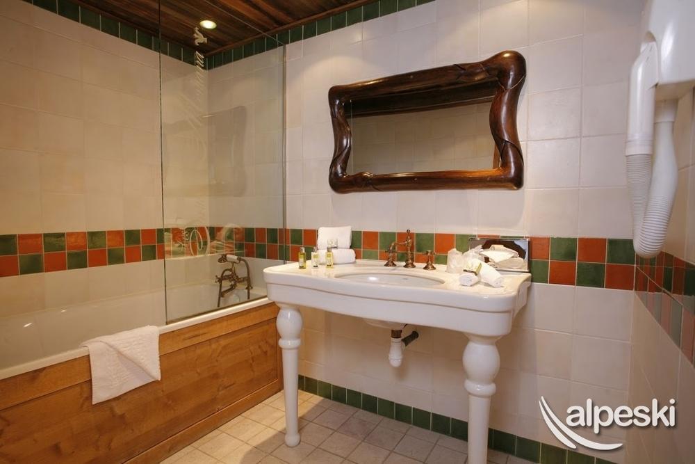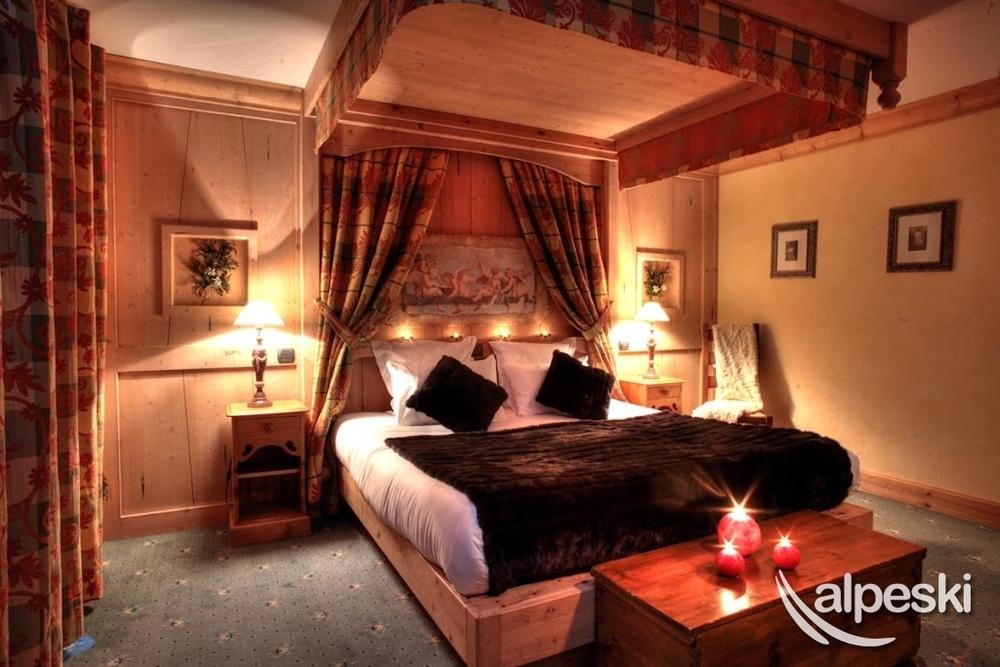 Suite de estilo Saboyardo con sala de estar con sofá y chimenea, dormitorio con cama de matrimonio, vestidor privado, cuarto de baño con WC, bañera de hidromasaje, sauna, secador de pelo, calentador de toallas, TV LCD vía satélite, reproductor de DVD, teléfono de línea directa, conexión Wi-Fi gratuita, caja fuerte y balcón.