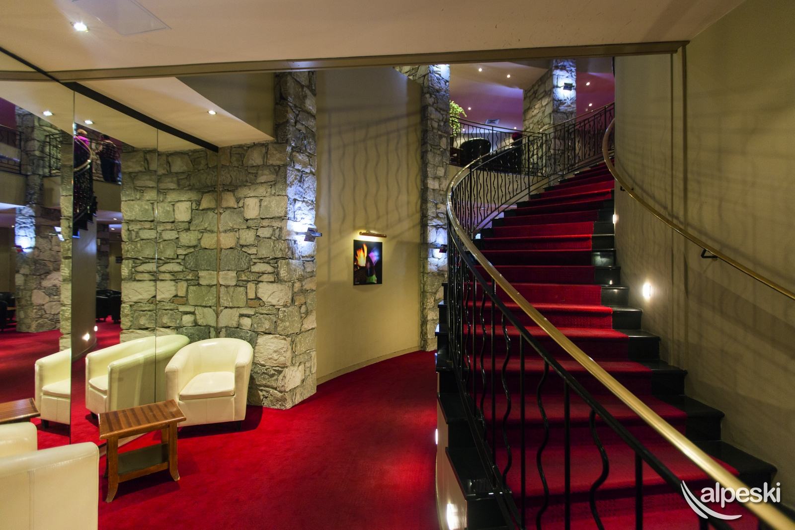 En su interior, en contraste con su aspecto exterior, las zonas comunes son muy amplias y la decoración moderna y lujosa; sólo algunos pilares y pequeñas paredes dejan asomar la piedra que nos recuerda que estamos en un hotel de montaña.