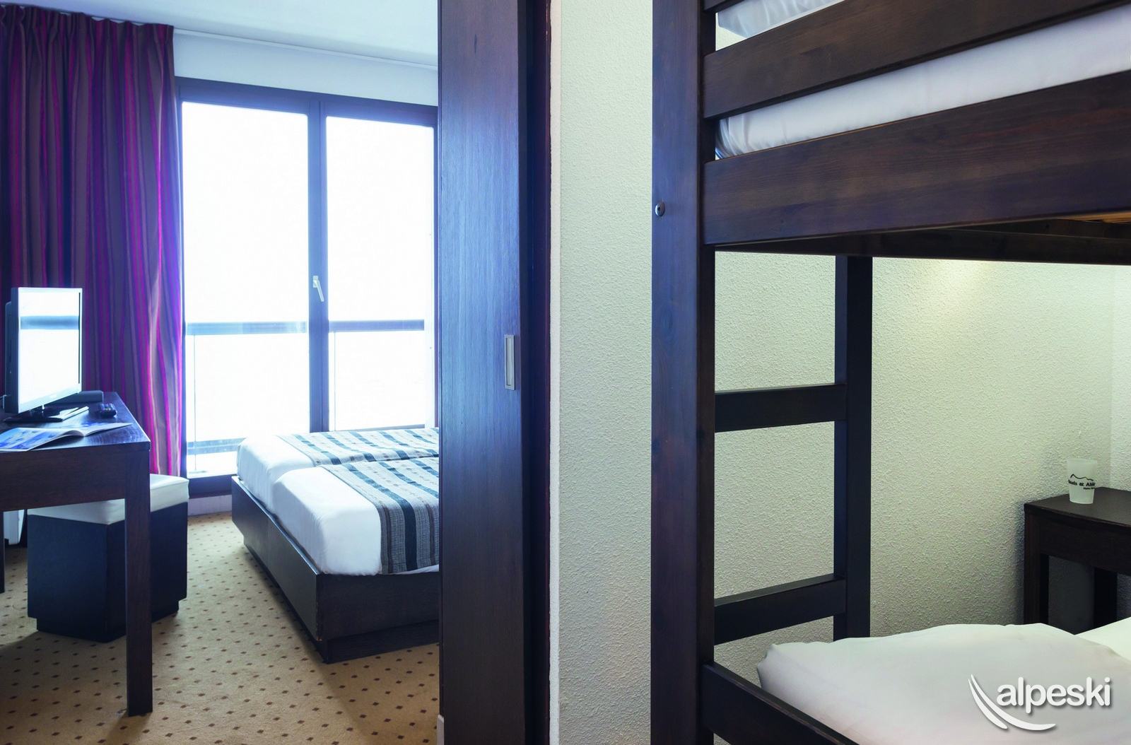 20 metros cuadrados. Con cama doble y dos sofás cama, calefacción, teléfono, televisión vía satélite y baño completo con WC separado. Con vistas a las pistas y la mayoría con balcón. Algunas comunicadas.