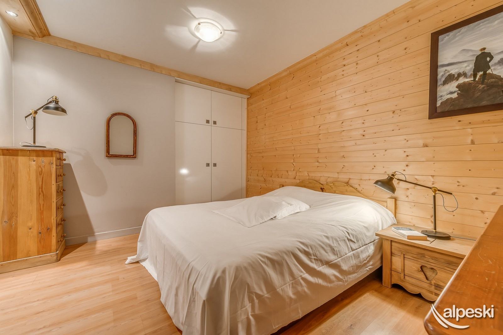 - Dormitorio N ° 4 con ventana que da a la sala de estar1 con: 1 cama de matrimonio 140, 1 armario grande, 1 cómoda, 2 mesitas de noche + lámparas.