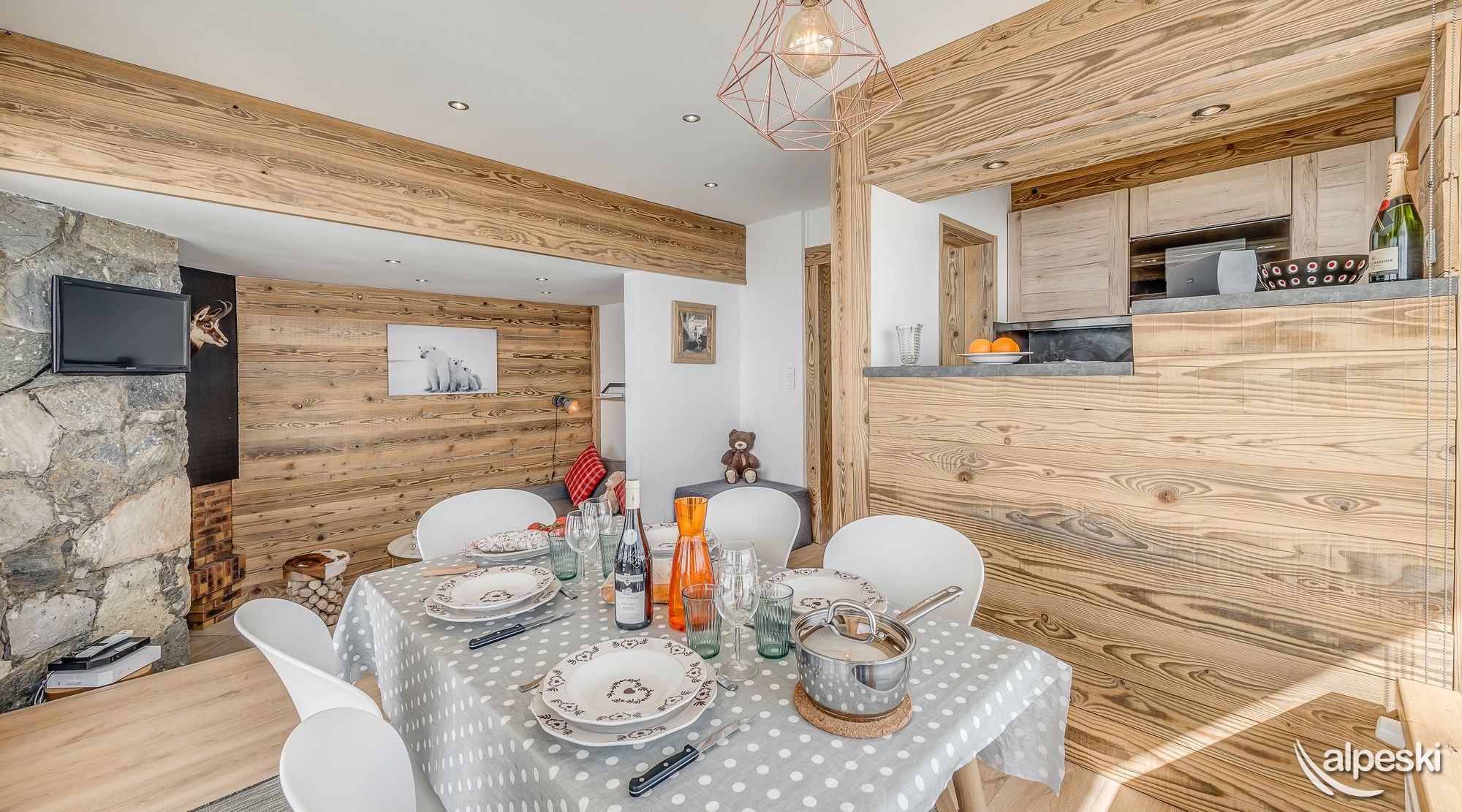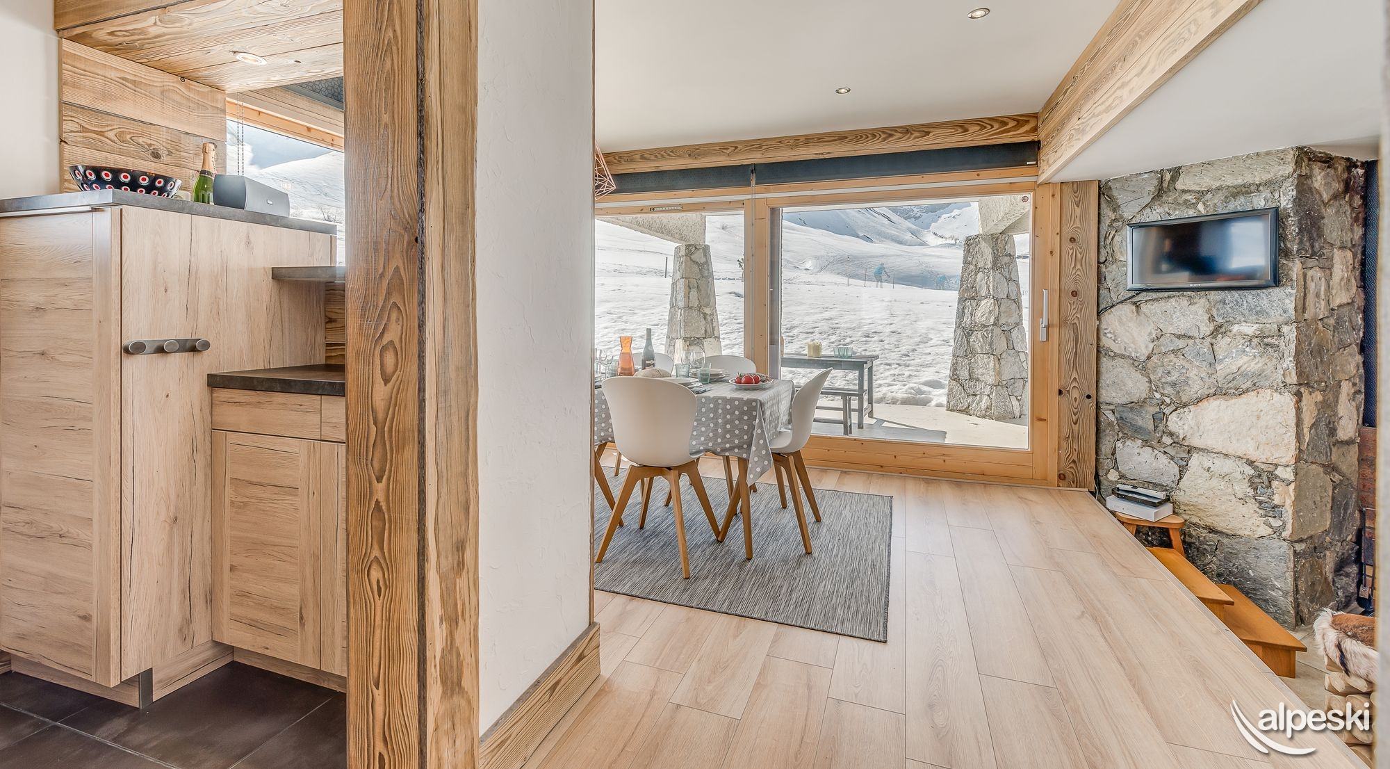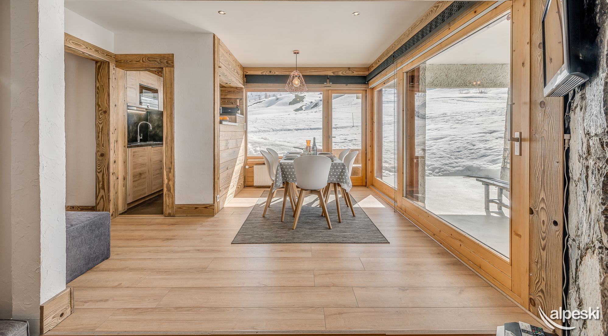 Apartamento completamente reformado, decoración de madera que le da un estilo cálido y confortable, muy luminoso gracias a dos grandes ventanales que dan al campo de golf (en verano) y al recinto cubierto de nieve (en invierno).