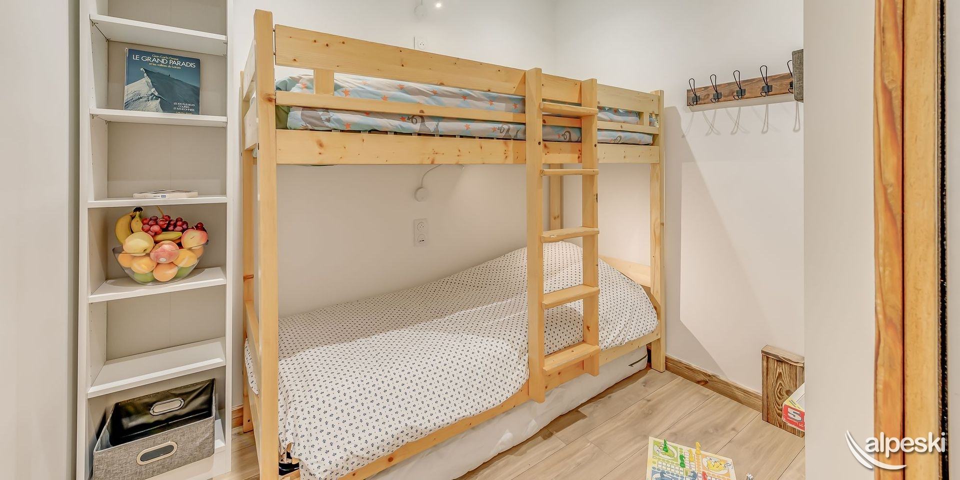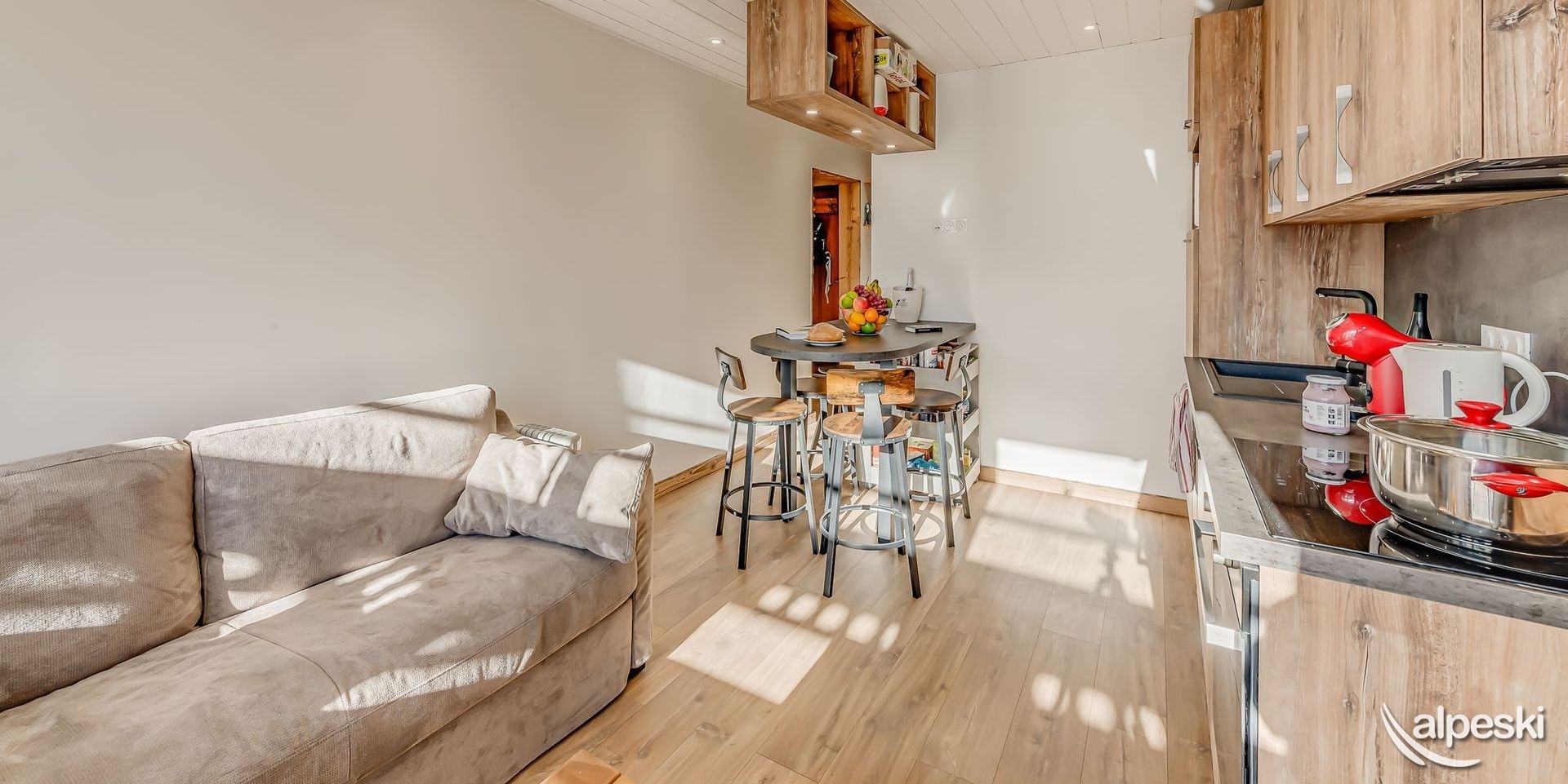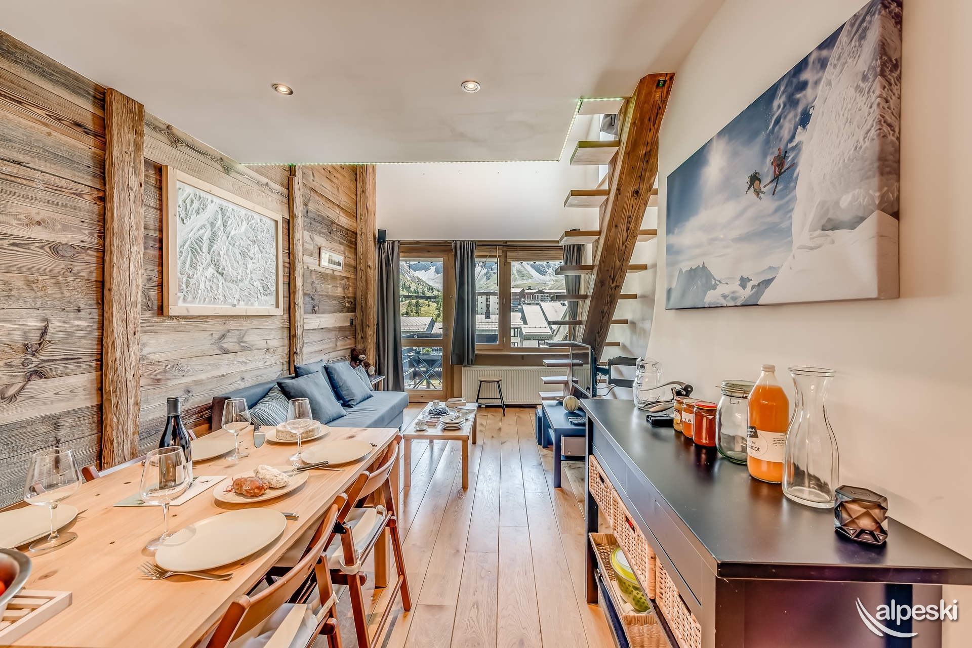 LES HAMEAUX de TOVIERE 5-5 - "TIGNES VISION". Apartamento de 2 habitaciones gama PREMIUM para 4/5 personas - 1.ª planta sin ascensor, 38 m², orientación SUR. Guardaesquís en la entrada de la residencia. 1 entrada para descalzarse, suelo de parquet vinílico, armario, radiador para secar las botas de esquí. 1 aseo independiente (inodoro suspendido). 1 baño con ducha a ras de suelo, mampara de cristal, mueble bajo lavabo, toallero calefactado y lavadora. 1 camarote con 2 literas y puerta corredera de madera. 1 dormitorio con cama doble, armarios y salida a la terraza. Orientación sur. 1 salón con 1 sofá cama individual, TV de pared y conexión a internet. Ventanal y puerta-ventana orientados al sur con acceso a una terraza de 35 m² orientada al sur. Comedor con mesa alta y tronas, junto a la cocina. Cocina abierta al comedor, totalmente equipada: nevera con congelador, 3 placas vitrocerámicas y campana extractora, horno, microondas, lavavajillas y armarios. Las camas incluyen edredones. Gama TIGNES PREMIUM - SERVICIOS DE HOTEL INCLUIDOS: ropa de cama y toallas, limpieza de final de estancia (excepto cocina). Los siguientes servicios no están incluidos, pero están disponibles con un coste adicional y deben reservarse con antelación: - Alquiler de minicaja wifi de 5 GB/día a 39,00 €/semana - Aparcamiento público cubierto obligatorio: Reservar directamente en la web de INDIGO - Cama doble: 20,00 € - Silla doble: 20,00 €. Mascotas: No se admiten. Apartamento para no fumadores. Depósito de garantía: 1250,00 €.