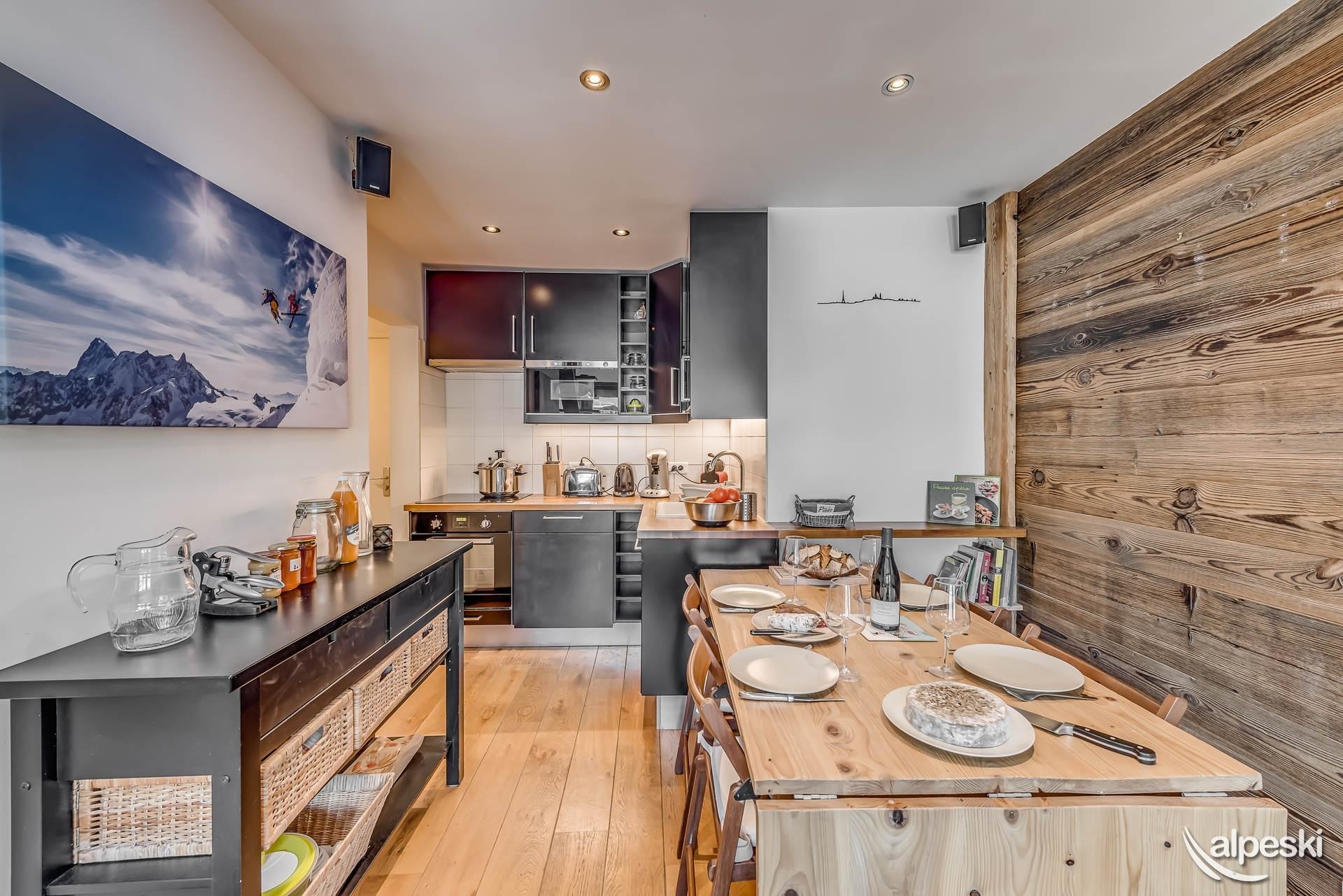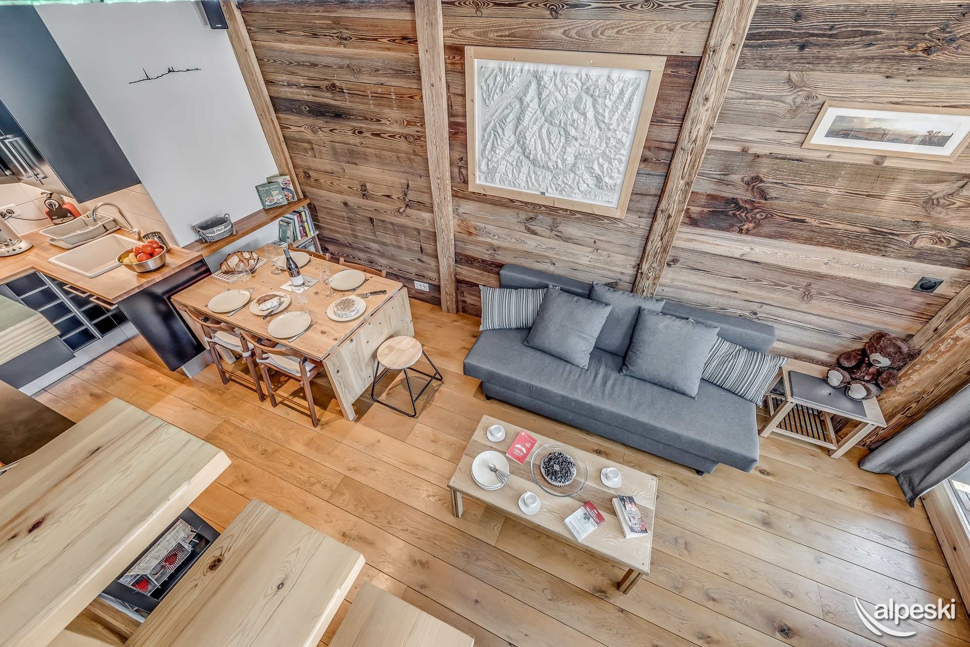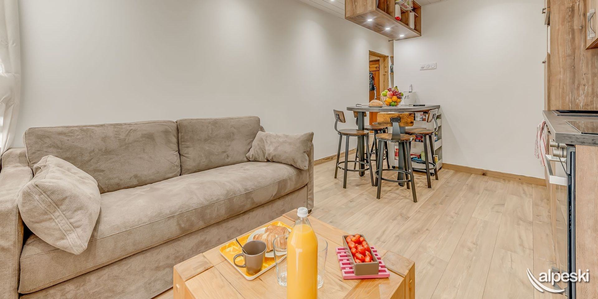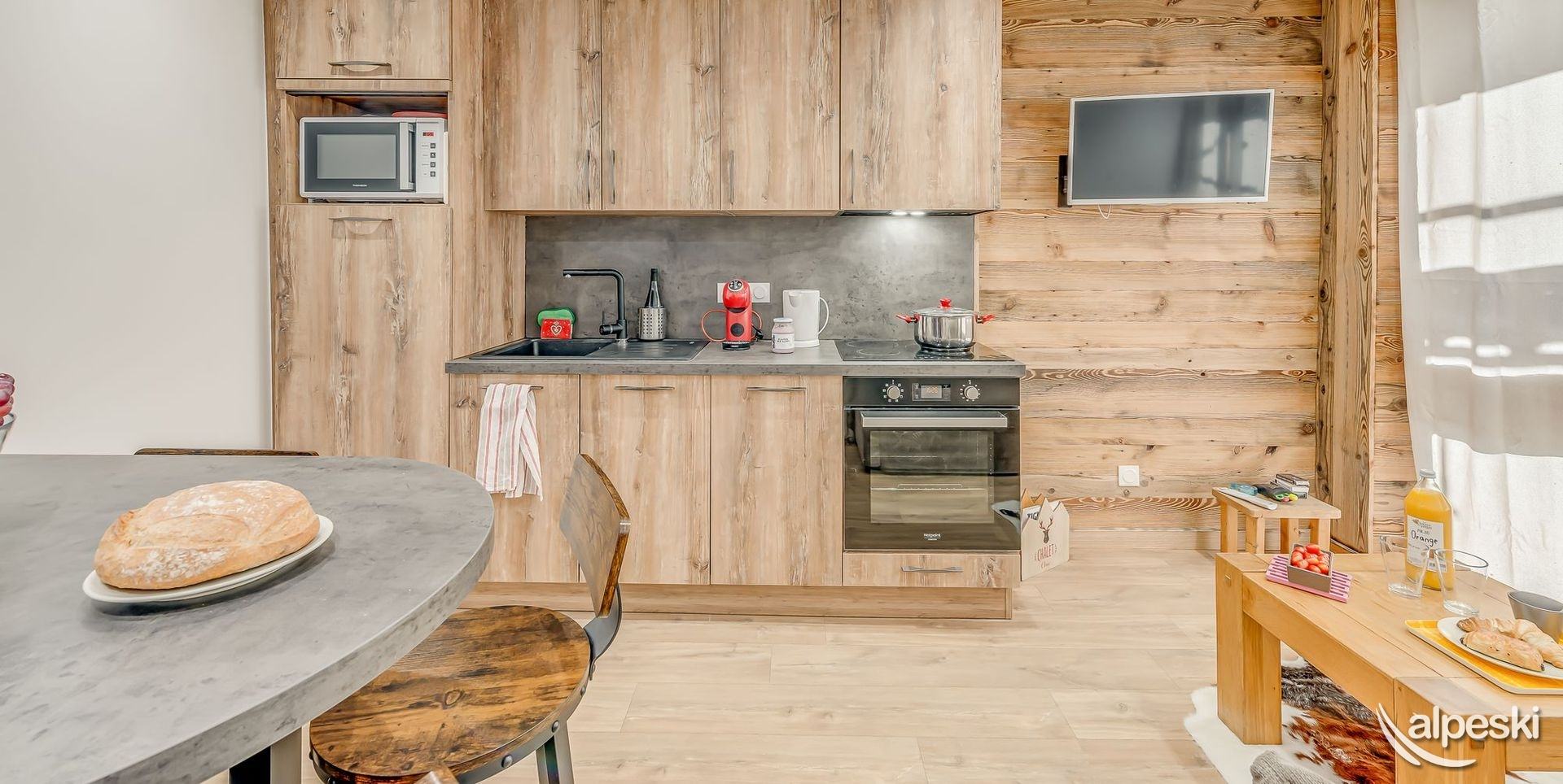 LES HAMEAUX de TOVIERE 5-5 - "TIGNES VISION". Apartamento de 2 habitaciones gama PREMIUM para 4/5 personas - 1.ª planta sin ascensor, 38 m², orientación SUR. Guardaesquís en la entrada de la residencia. 1 entrada para descalzarse, suelo de parquet vinílico, armario, radiador para secar las botas de esquí. 1 aseo independiente (inodoro suspendido). 1 baño con ducha a ras de suelo, mampara de cristal, mueble bajo lavabo, toallero calefactado y lavadora. 1 camarote con 2 literas y puerta corredera de madera. 1 dormitorio con cama doble, armarios y salida a la terraza. Orientación sur. 1 salón con 1 sofá cama individual, TV de pared y conexión a internet. Ventanal y puerta-ventana orientados al sur con acceso a una terraza de 35 m² orientada al sur. Comedor con mesa alta y tronas, junto a la cocina. Cocina abierta al comedor, totalmente equipada: nevera con congelador, 3 placas vitrocerámicas y campana extractora, horno, microondas, lavavajillas y armarios. Las camas incluyen edredones. Gama TIGNES PREMIUM - SERVICIOS DE HOTEL INCLUIDOS: ropa de cama y toallas, limpieza de final de estancia (excepto cocina). Los siguientes servicios no están incluidos, pero están disponibles con un coste adicional y deben reservarse con antelación: - Alquiler de minicaja wifi de 5 GB/día a 39,00 €/semana - Aparcamiento público cubierto obligatorio: Reservar directamente en la web de INDIGO - Cama doble: 20,00 € - Silla doble: 20,00 €. Mascotas: No se admiten. Apartamento para no fumadores. Depósito de garantía: 1250,00 €.