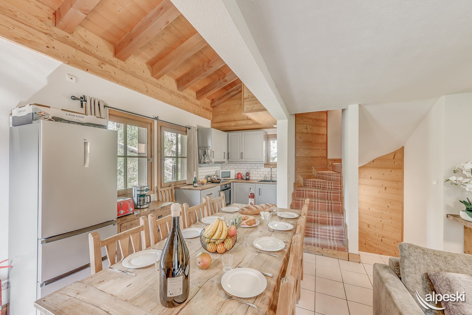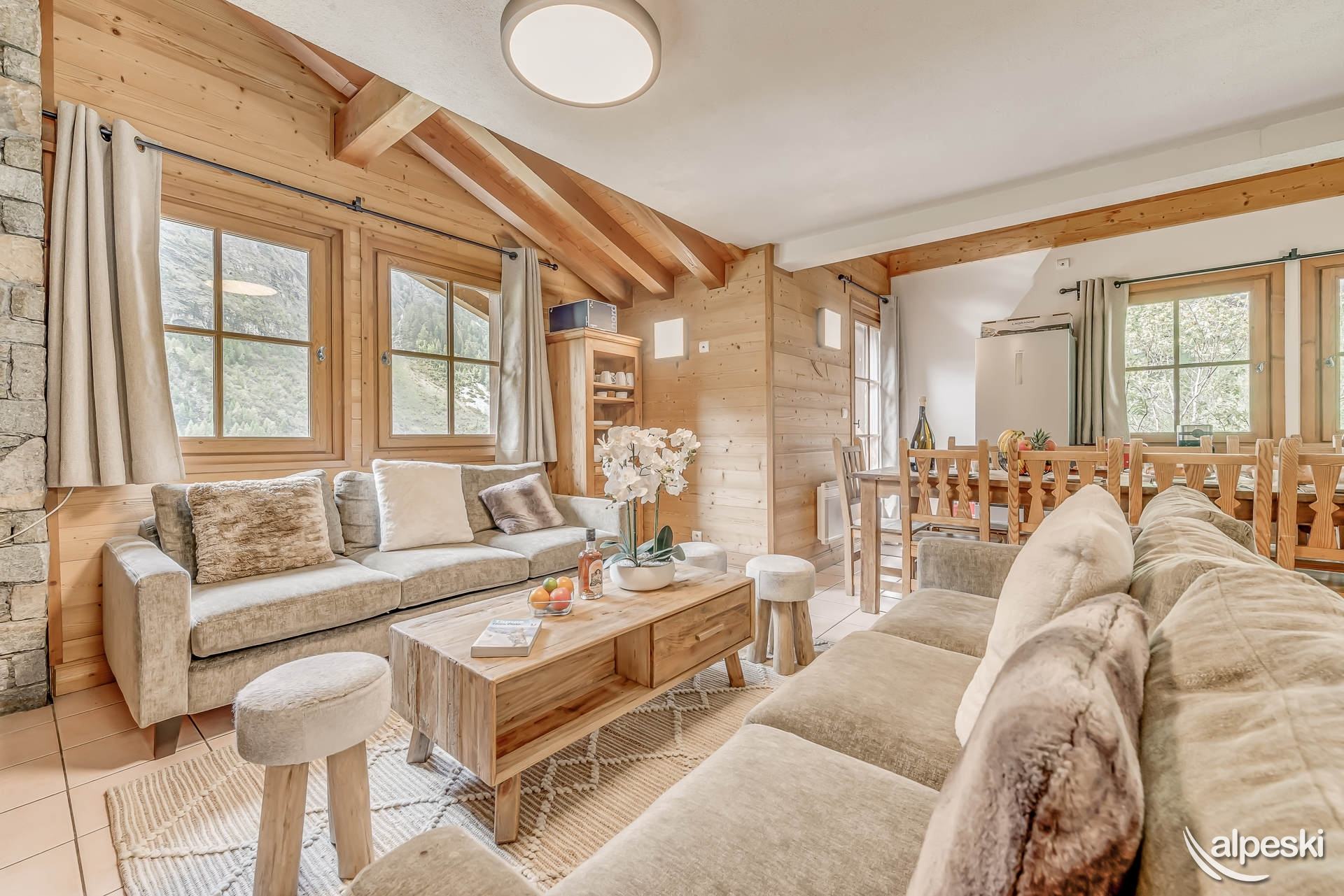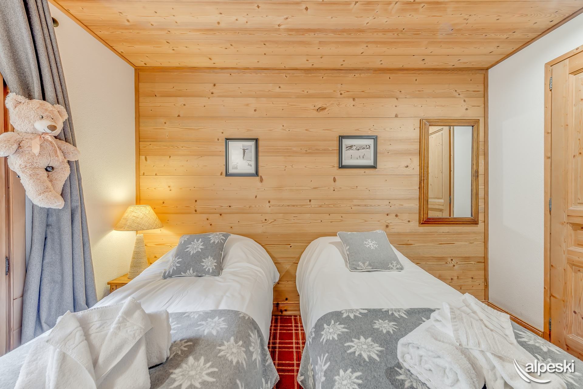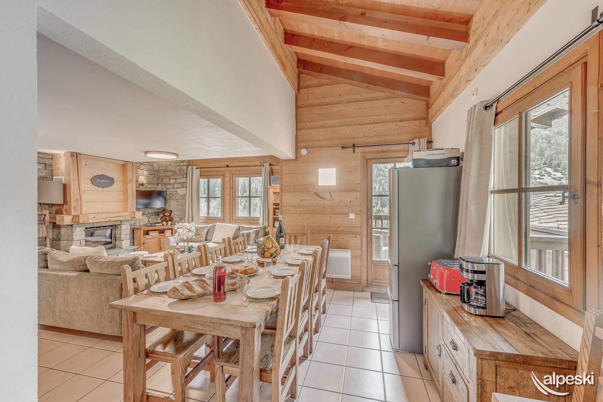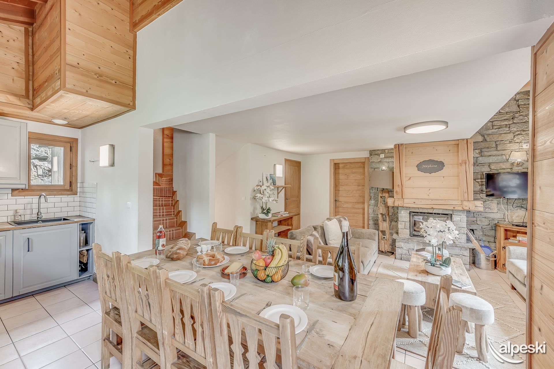 Chalet Josephine - 108 m² - 6 habitaciones para 10 personas - dispone de 5 dormitorios, cada uno con baño y jacuzzi. Se encuentra a 200 metros de los remontes y del centro del pueblo mediante un telesquí que conecta la zona de Belvédère, donde se encuentra el chalet, con el centro del pueblo (tiendas, bares, restaurantes...) y con los remontes (telecabina de Brévières). El chalet ofrece impresionantes vistas a las montañas y a las pistas de esquí. El Chalet Joséphine se compone de: Planta baja: - Dormitorio 1 (ventana) con 2 camas individuales de 190 x 80 (convertibles en cama de matrimonio), 1 baño: bañera, lavabo e inodoro. - Dormitorio 2 con 2 camas individuales de 190 x 80 (convertibles en cama de matrimonio), 1 baño: bañera, lavabo e inodoro. Acceso a la terraza orientada al sur con jacuzzi. En la planta 1: - Dormitorio 3 (balcón) con 2 camas individuales de 190x80 (convertibles en cama doble), 1 baño: bañera, lavabo e inodoro. - Dormitorio 4 (ventana) con 2 camas individuales de 190x80 (convertibles en cama doble), 1 baño: bañera, lavabo e inodoro. En la planta 2: Amplio salón con balcón. Entrada principal al chalet con guardaesquís. 1 aseo. Cocina totalmente equipada: vitrocerámica, horno, lavavajillas, microondas y frigorífico. Comedor abierto. Salón con sofás. 1 televisor de pantalla plana. 1 chimenea. Planta 3 bajo techo: - Dormitorio 5 (ventana): con 2 camas individuales de 190x80 (convertibles en cama doble), 1 baño: bañera, lavabo e inodoro. Esta habitación, la más grande. SERVICIOS DEL HOTEL (incluidos en nuestros precios): - Recepción en el hotel. - Sábanas, toallas y zapatillas. - Camas hechas. - Leña (20 leños), cuna y trona. - Jacuzzi, Wifi, - Limpieza al final de la estancia excepto la cocina - Guardaesquís privado, sala de secado de botas de esquí. - 1 plaza de aparcamiento interior - Coste adicional Aparcamiento público exterior: A reservar directamente con el proveedor de servicios INDIGO - Animales: no se admiten animales - Apartamento para no fumadores - Depósito de garantía: 2500€