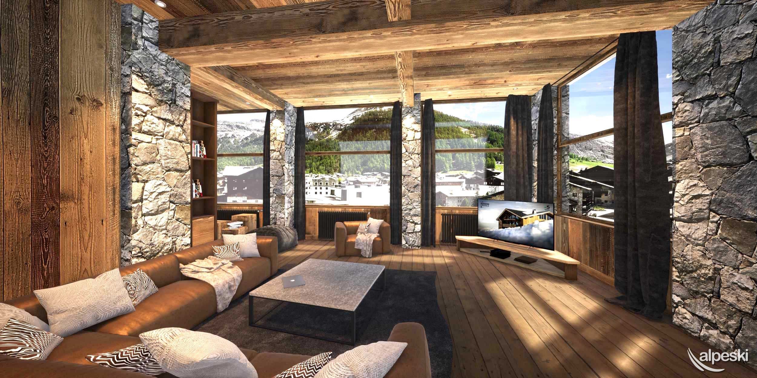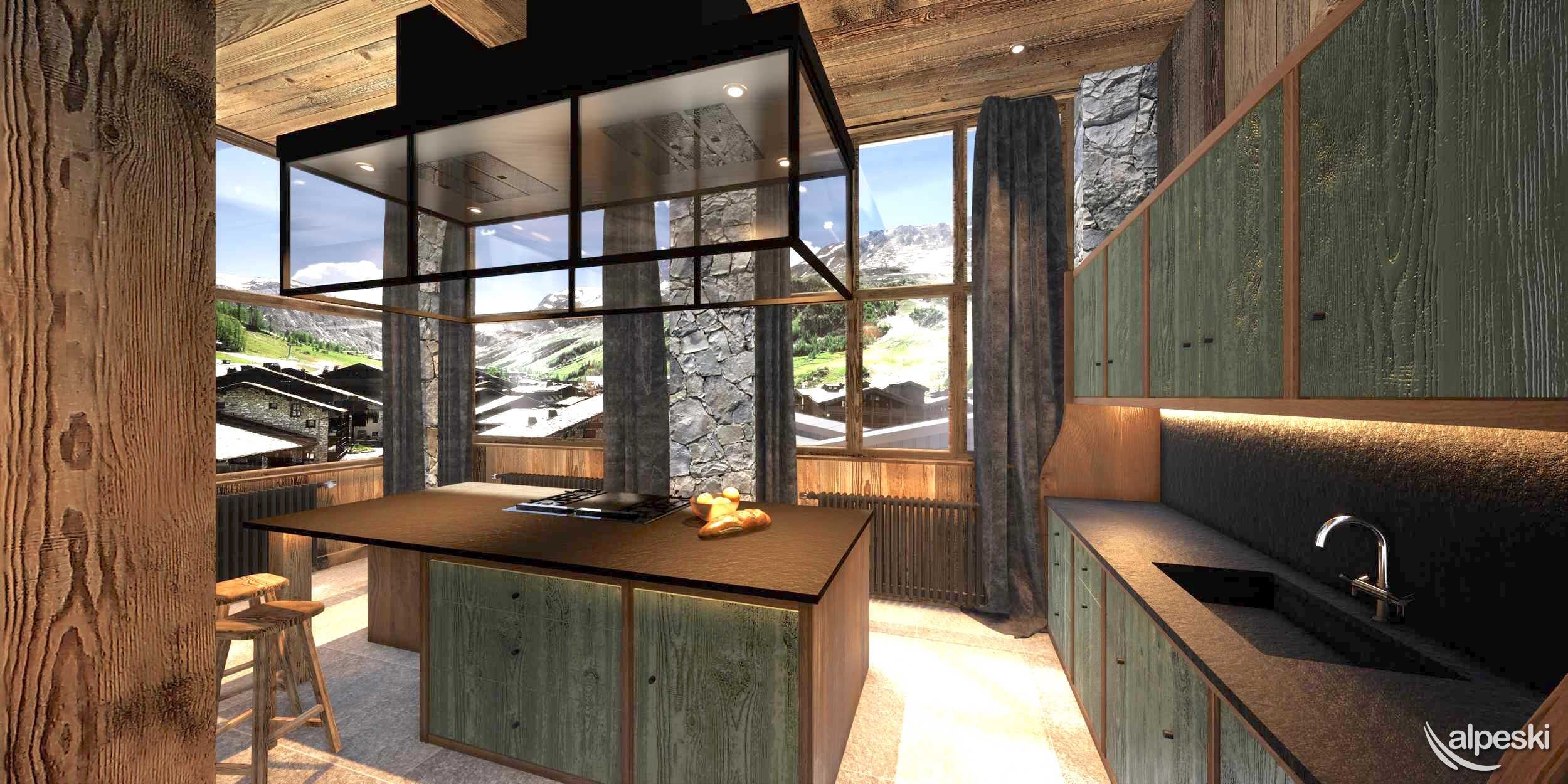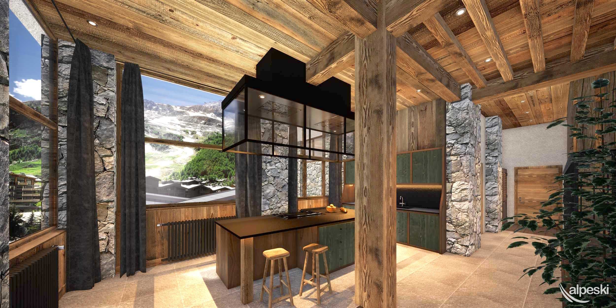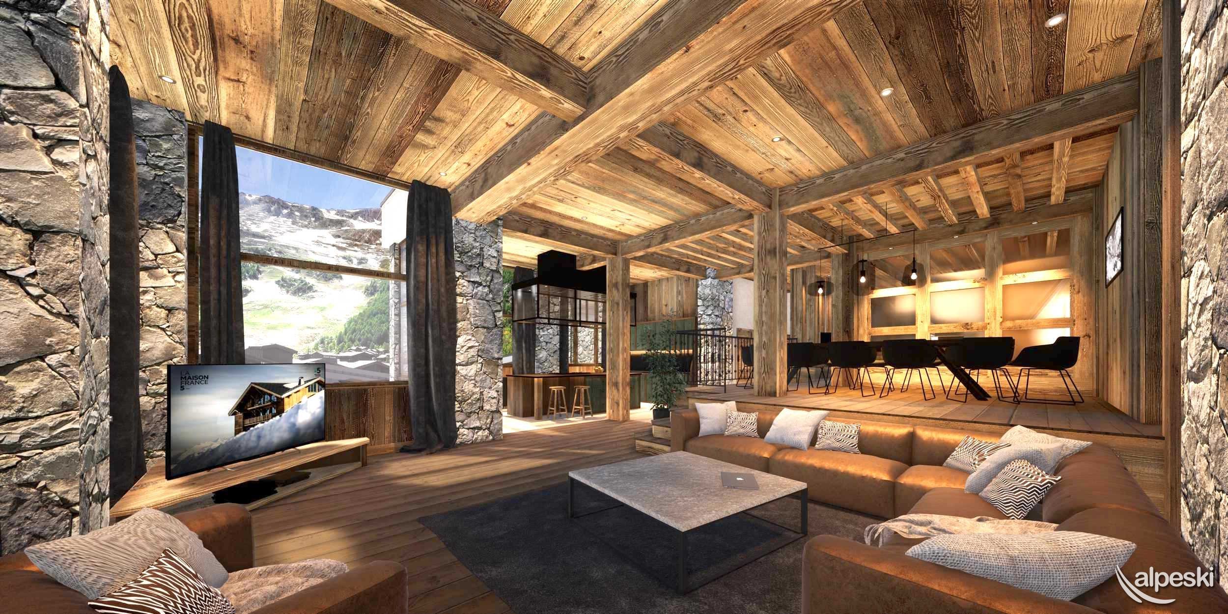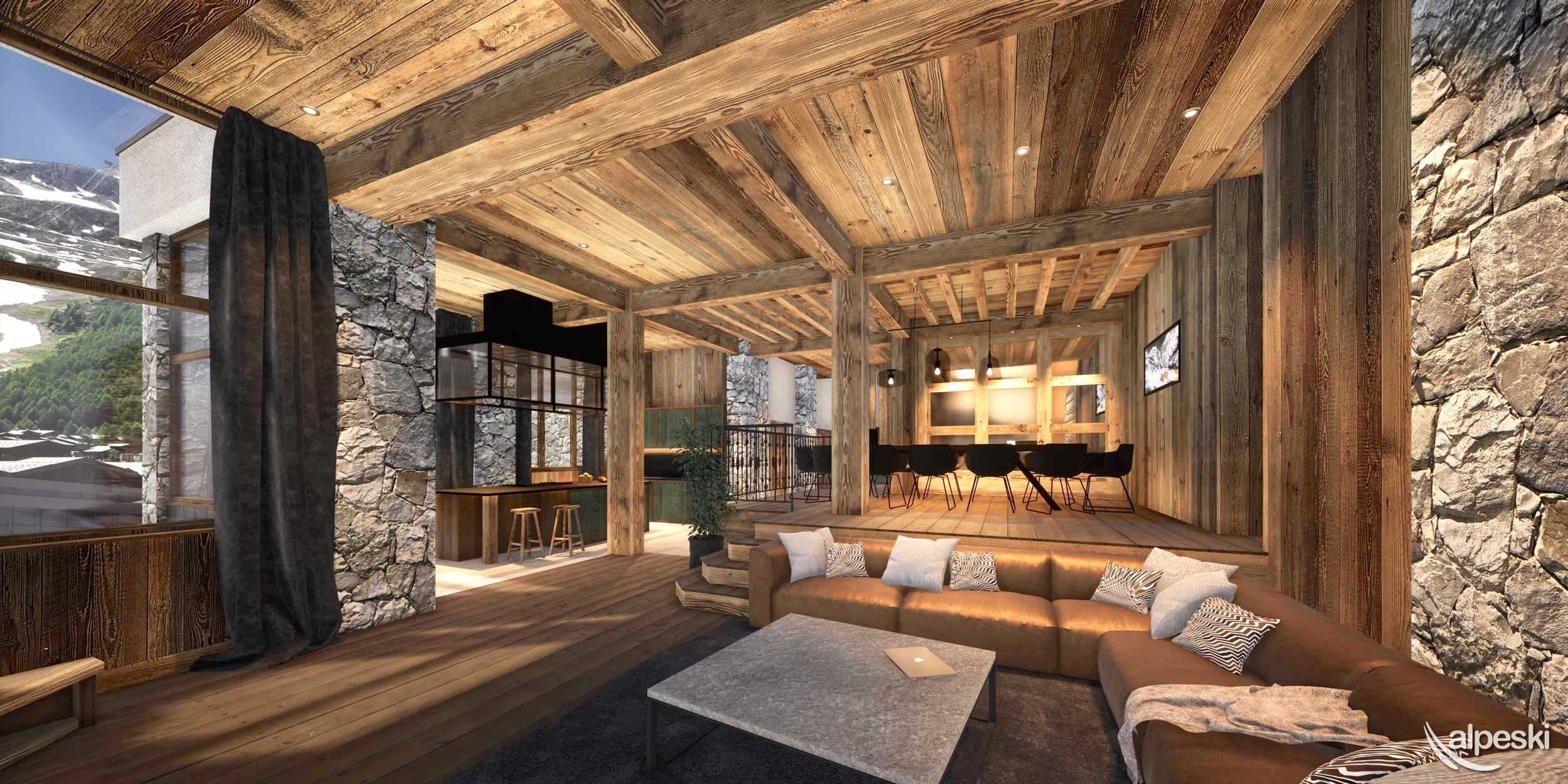 y una gran sala de estar con cocina abierta, jacuzzi privado en la terraza, lavandería y esquí.