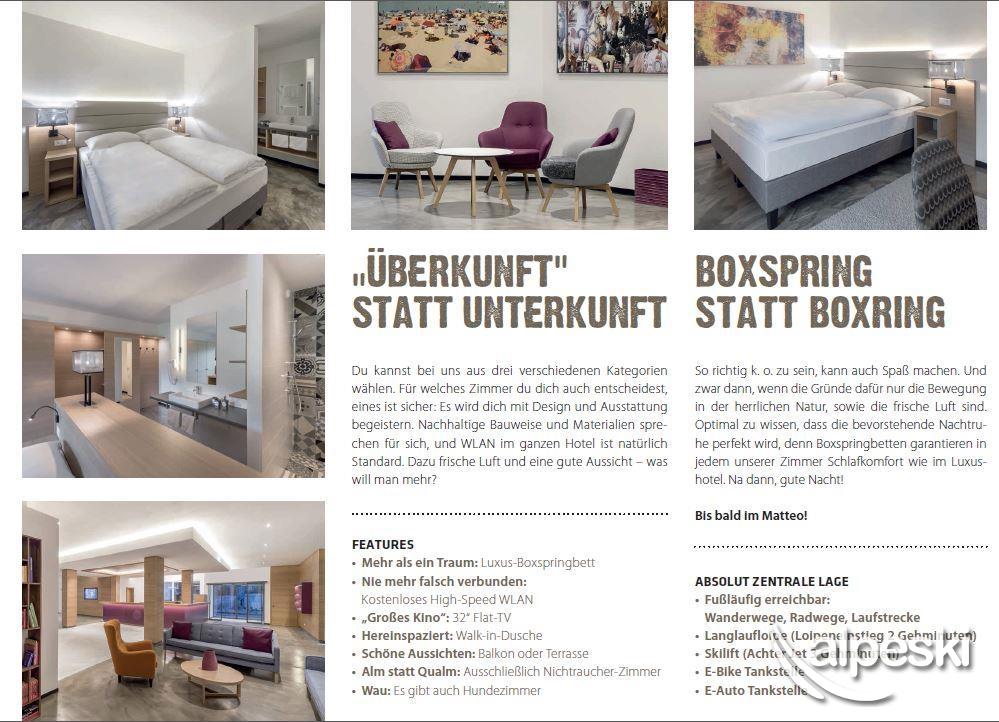 Hotel Matteo - be smart - stay clever! The hotel is situated in the center, ski bus stop are in Winter front of the house. The rooms are equipped with free W-LAN, Flat TV, bathroom with generous walk-in-shower, toilet each extra, safe, balcon or terrace. In-house restaurant, café and bar uniso “Paularei”.