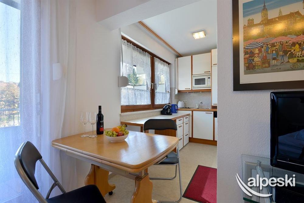 This studio apartment is located 7 walking minutes from the center of Kirchberg. It has 35 sqm with an entrance area, open plan kitchen and living area with a pull-out sofa bed.