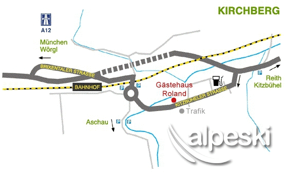 coming from Kitzbühel take the first access road to Kirchberg = Kitzbühelerstraße. Petrol station on the right, a few metres further on tobacconist shop (Tabak) on the left - Gästehaus Roland is directly opposite this shop - large car park, large lawn in front of house. See map!
