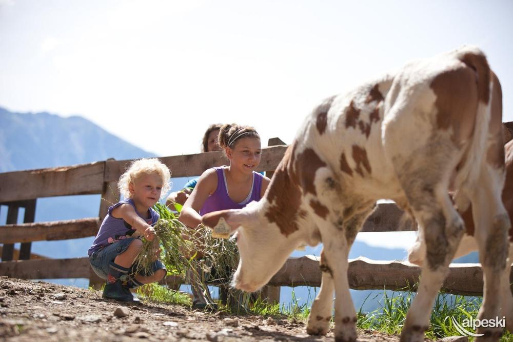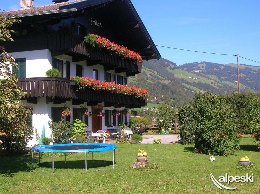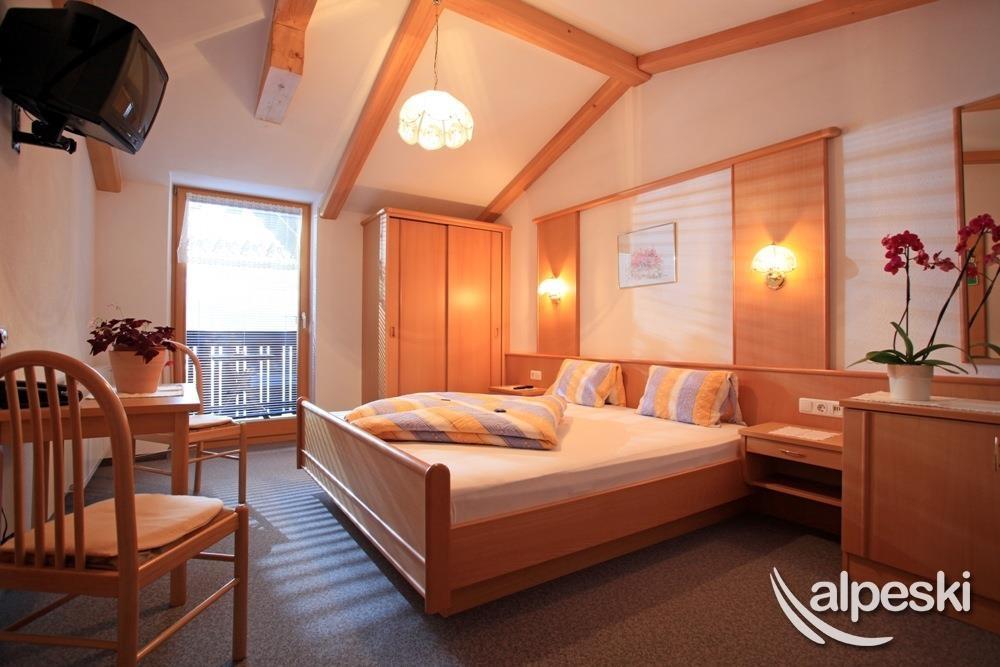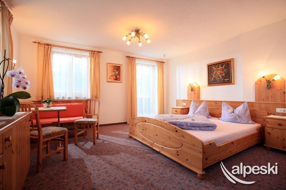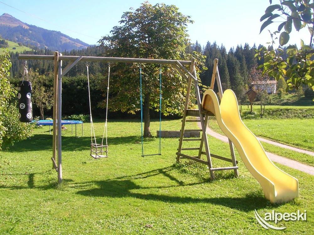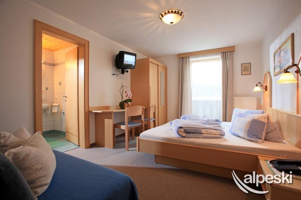 Farm in quiet, sunny location, about a 10 minutes’ walk from town. Proximity to swimming pool, gondola lift and cross-country trail. All rooms with private bathrooms and showers, balcony, satellite TV, radio and telephone. Breakfast buffet, common room with tiled stove, game room with billiards, darts etc. Guest refrigerator, ski room with boot dryer. Lawn for playing and sunbathing with swing, trampoline etc. Apartments, please see Farm table.