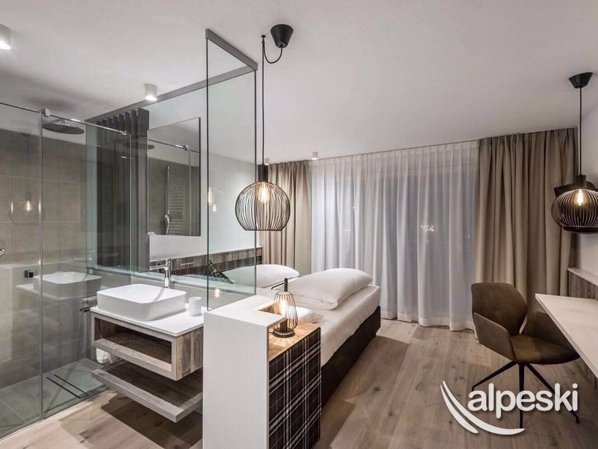 Todo con vista a Gardenaccia, en madera natural, equipado con todas las comodidades estándar: minibar, secador de pelo, caja fuerte y base para iPod. La ducha está separada del baño por una puerta corredera. Con posibilidad de 3 y 4 camas (solo para niños)