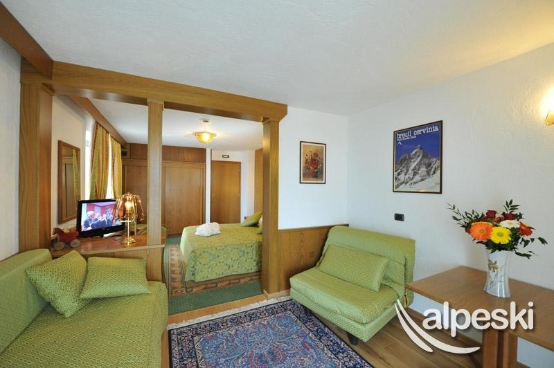 Se compone de una habitación doble o twin con una pequeña sala de estar con sofá-cama (doble normal). Habitación con balcón orientado al norte con vistas al Matterhorn o al sur, equipadas con televisión, teléfono, radio, caja fuerte, mini-bar y secador de pelo. Cuarto de baño con bañera y ducha.